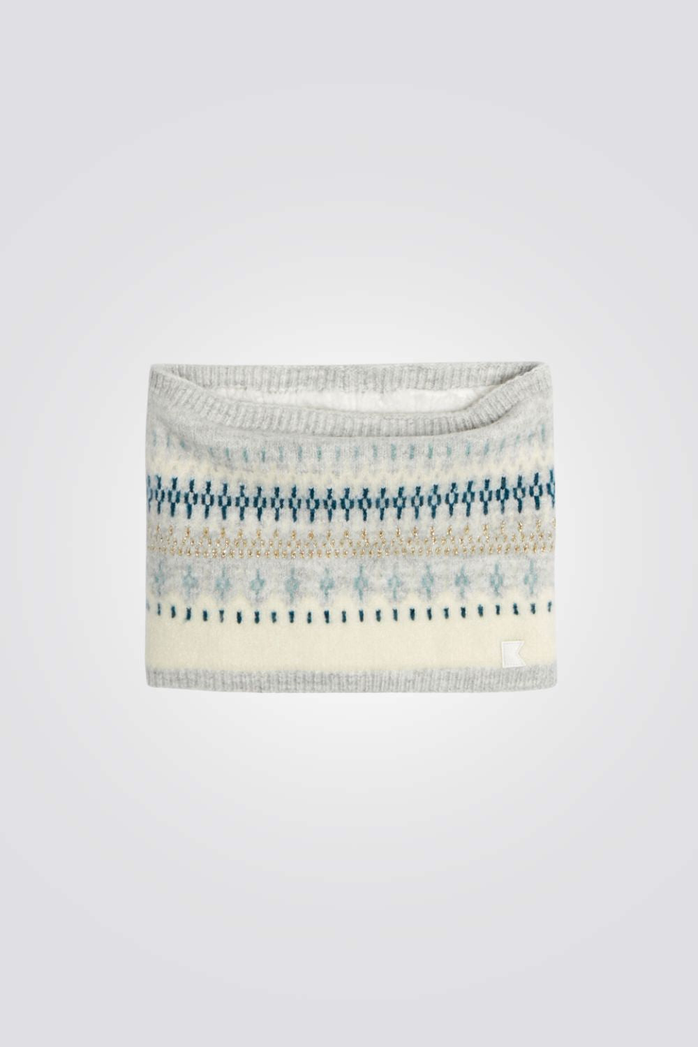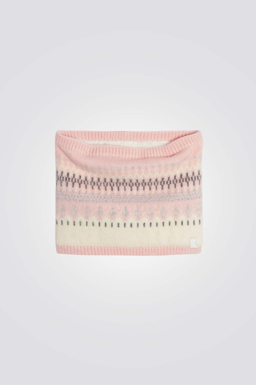 חם צוואר לילדות מבית המותג OKAIDI, בצבעים אפור וורוד עם הדפס, מחמם ונעים ומגן על הצוואר, עם צמר מבפנים ומבחוץ בד סריג רך ונמתח.