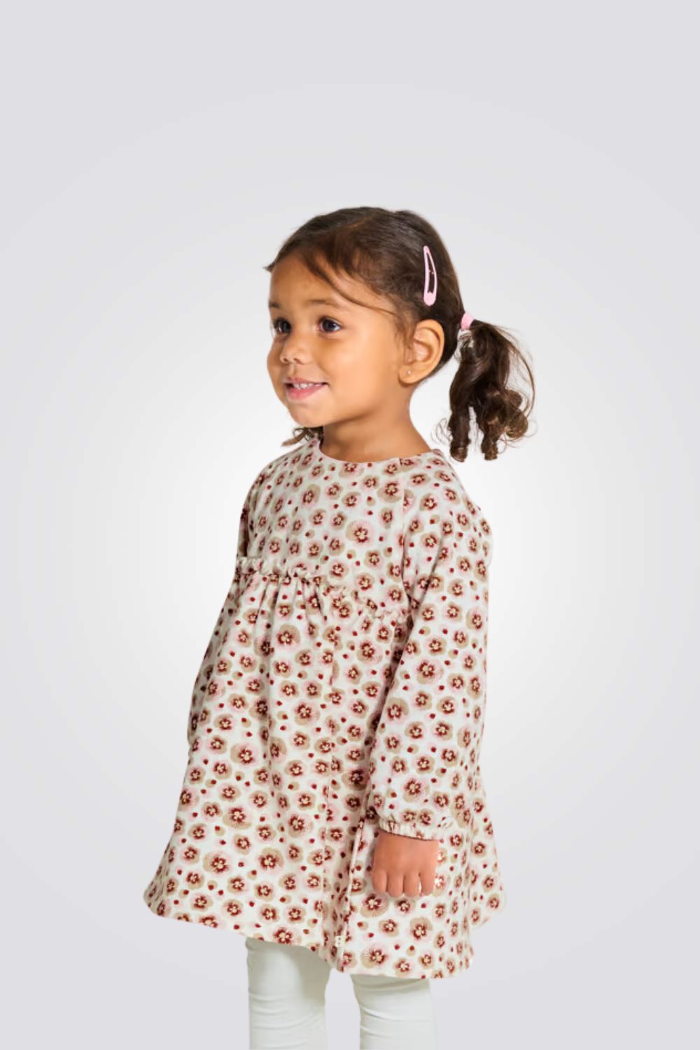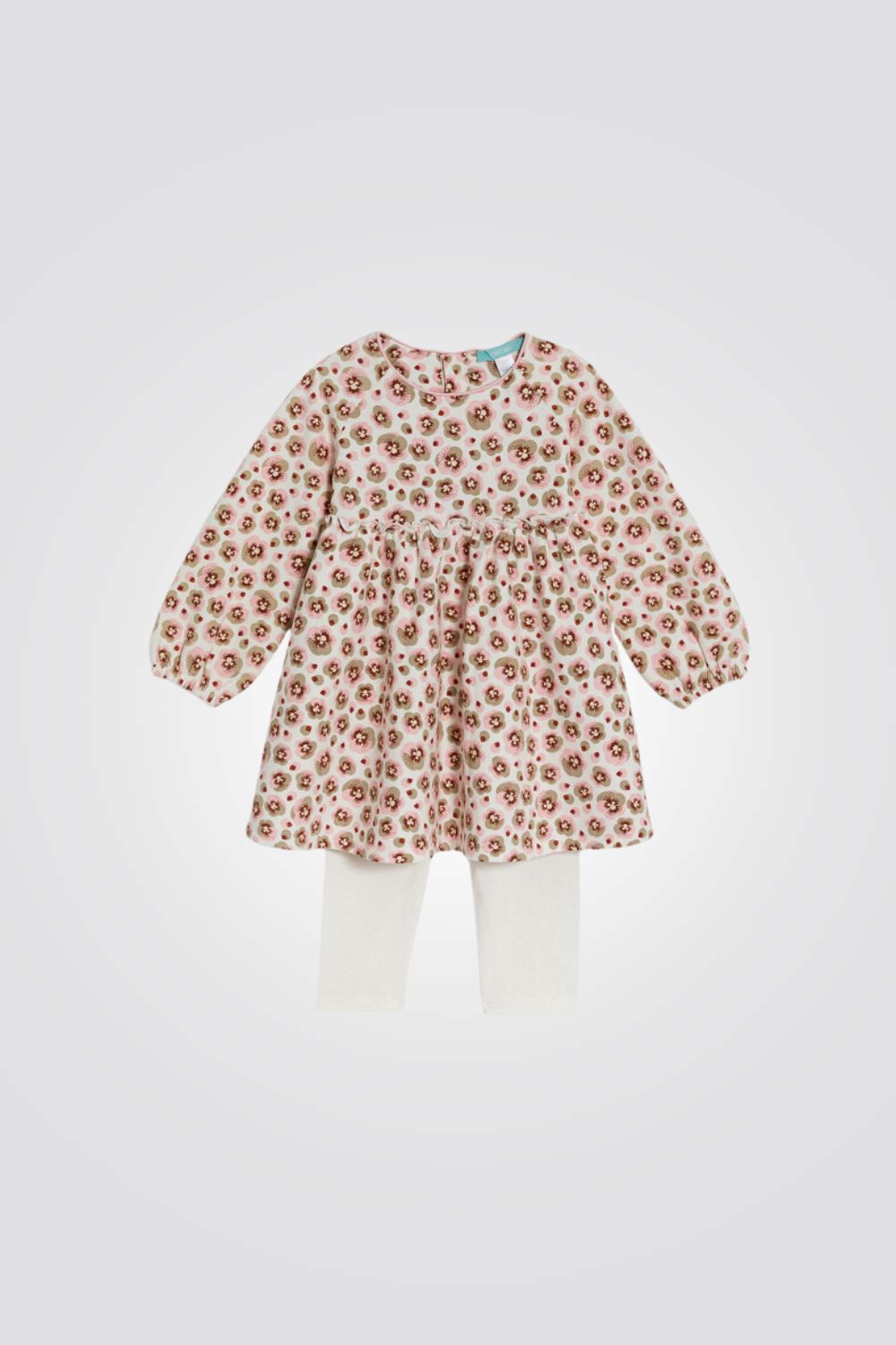 חליפת שמלה לילדות מבית המותג OKAIDI, שמלה בצבע בז' עם הדפס פרחוני ,שרוולים ארוכים וצווארון עגול וסגירת כפתורים מאחור, ומכנסי טייץ בצבע לבן עם מותן אלסטית.