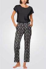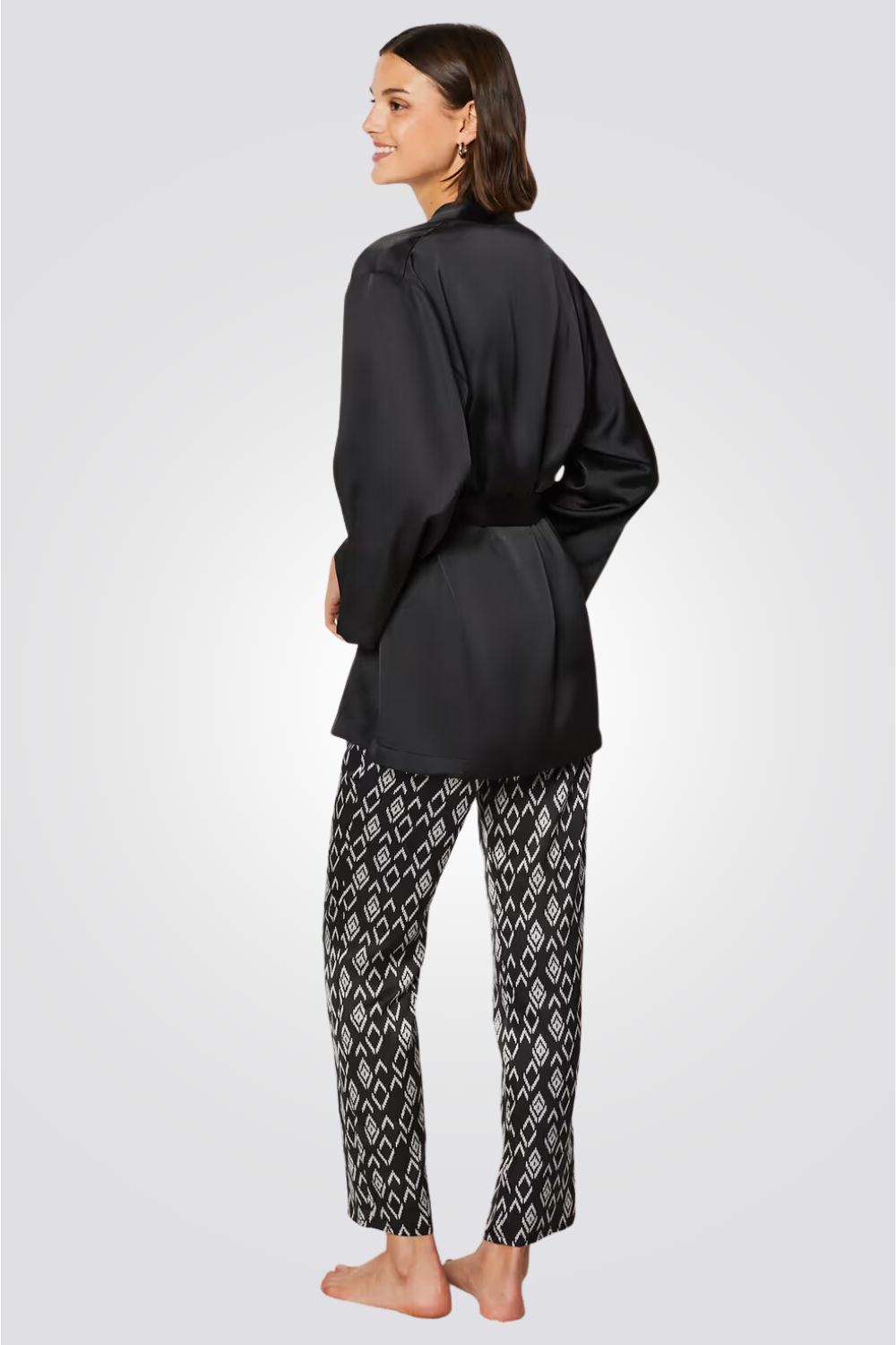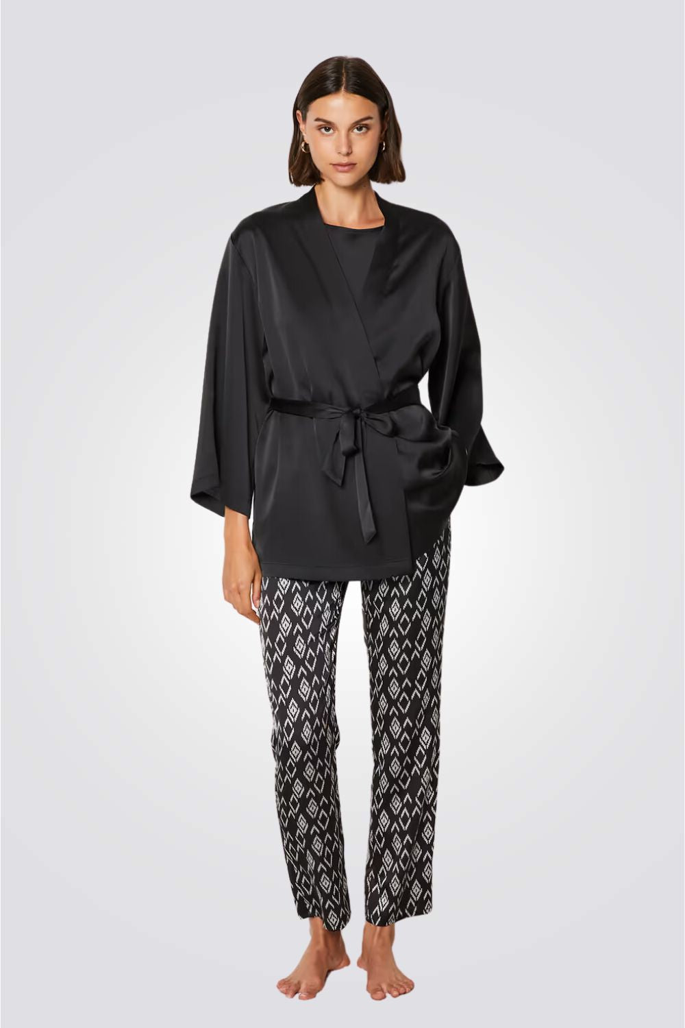 סט פיג'מת מעבר מבית המותג הצרפתי ETAM עשויה מבד סאטן רך ונעים ומורכבת משלושה חלקים, חולצה קצרה עם צווארון עגול, מכנסיים ארוכים עם הדפס מעוניינים בצבע לבן ועם חלוק שחור קלאסי בעל שרוך קשירה.
