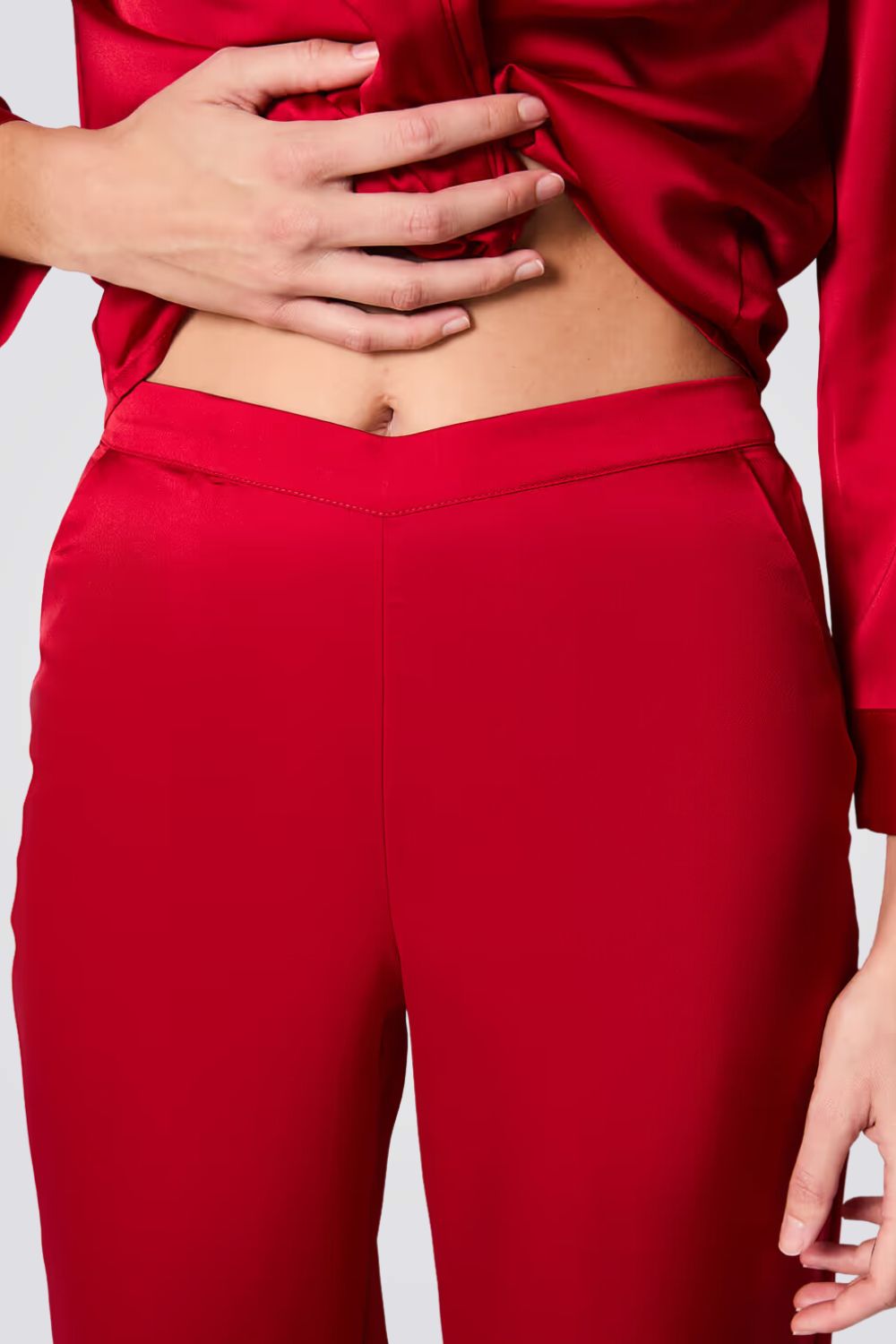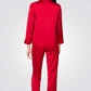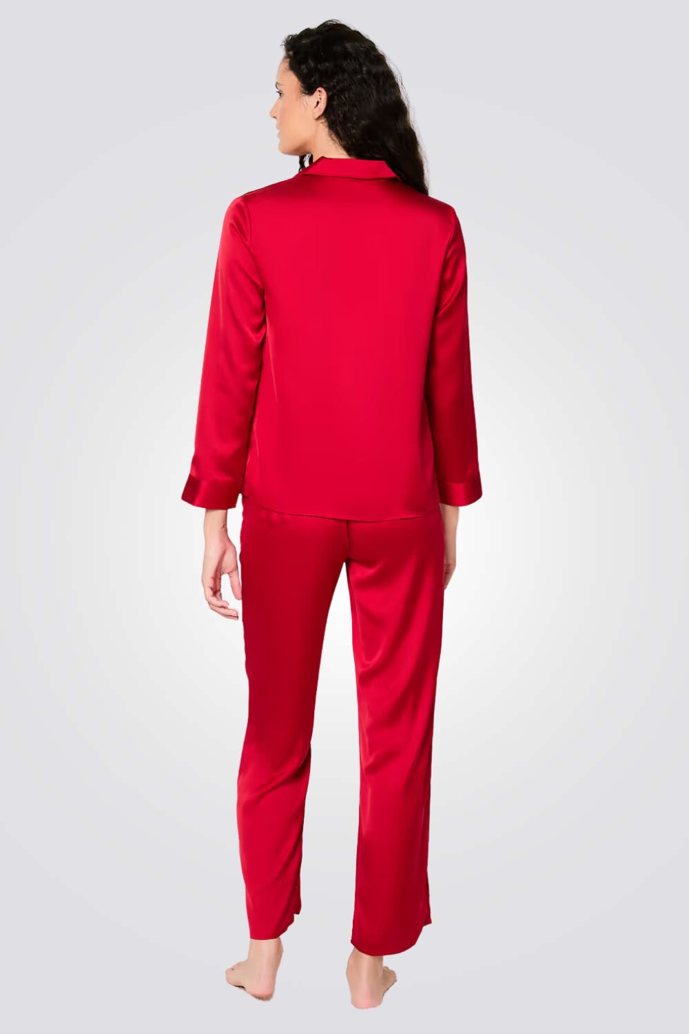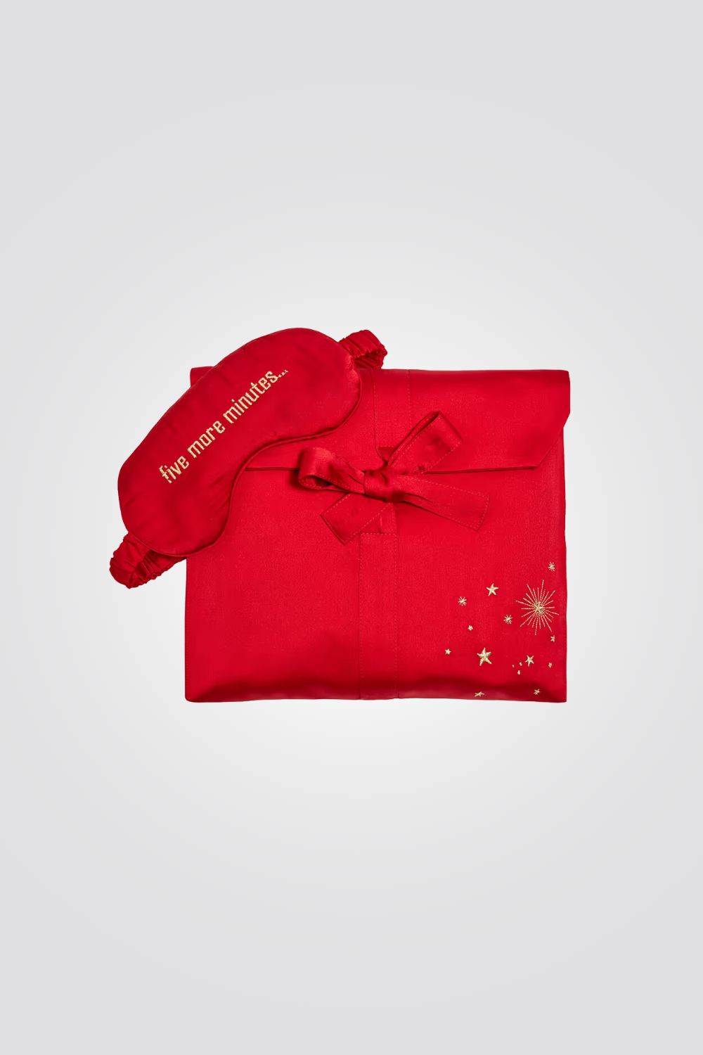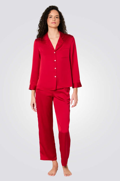 מארז סאטן לנשים מבית המותג ETAM בצבע אדום, סט המגיע בתוך פאוץ' המכיל חולצת פיג'מה מכופתרת בעלת שרוולים ארוכים, מכנסיים בגזרה מתרחבת עם גומי במותן ומסכת שינה תואמת.