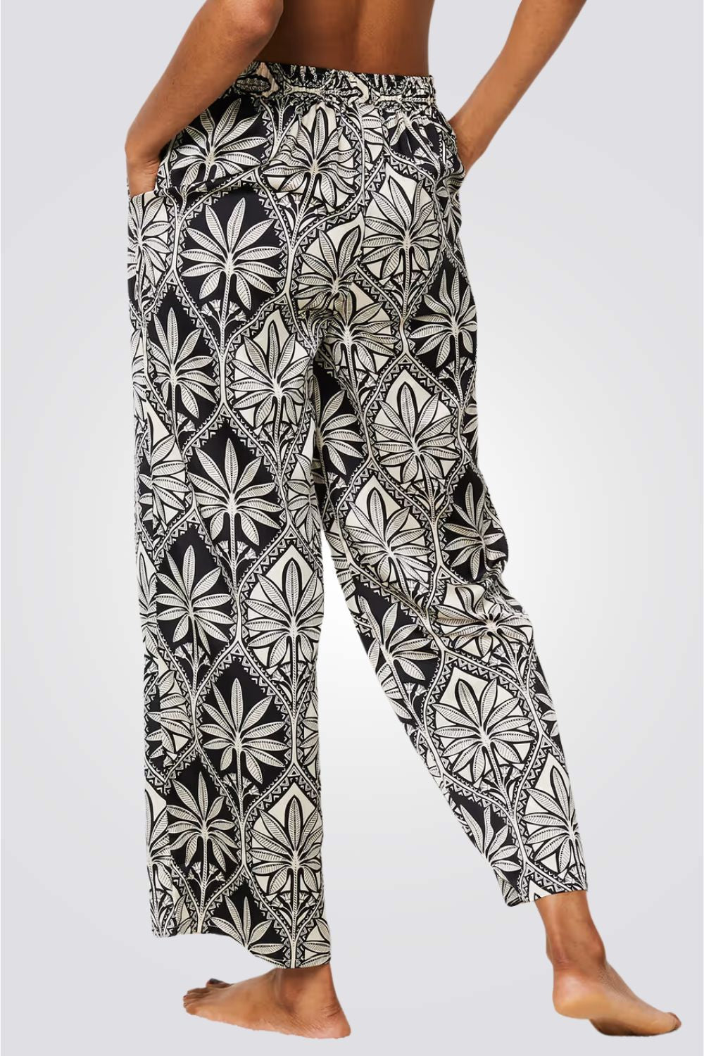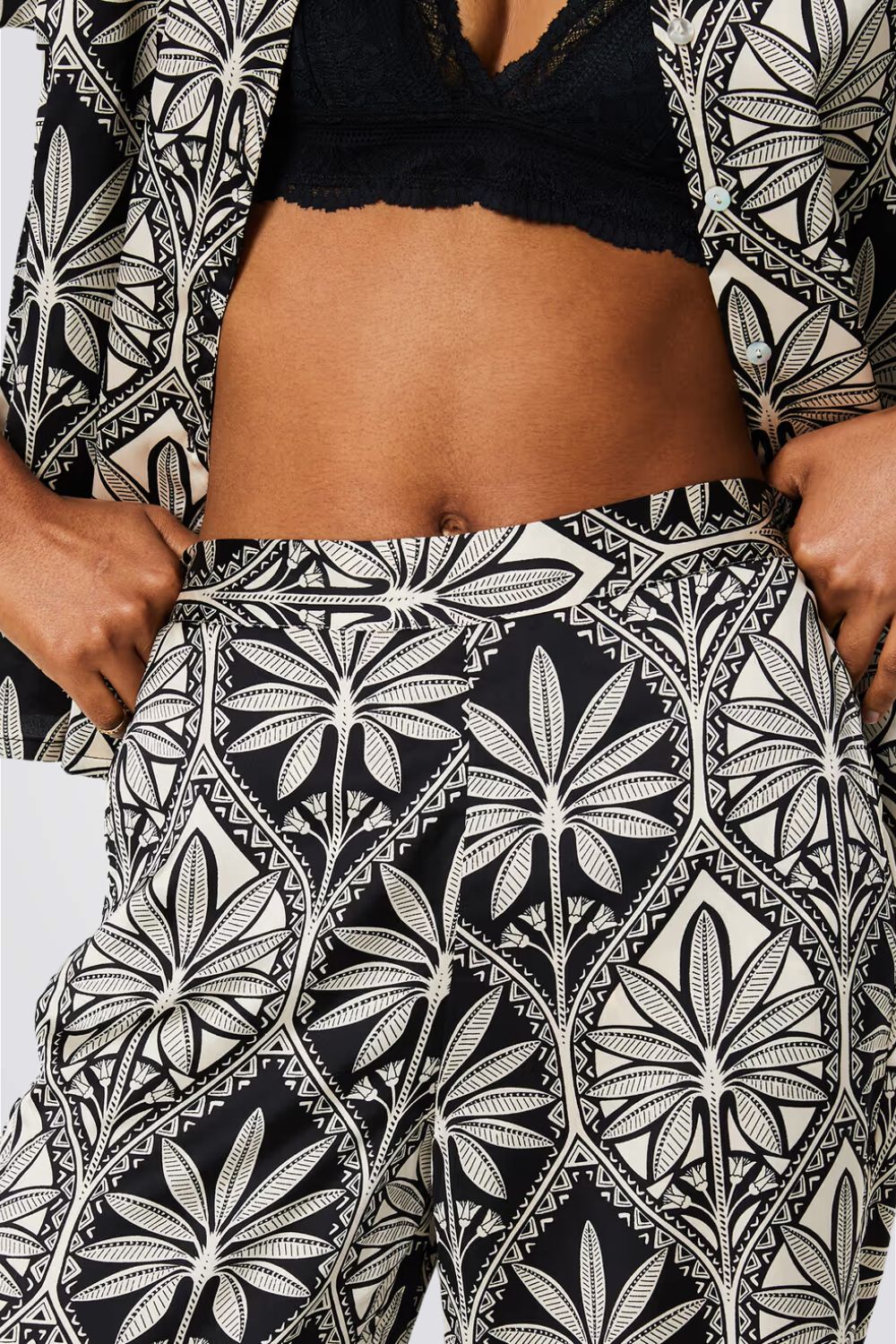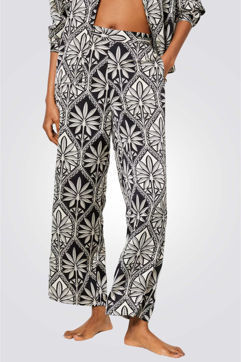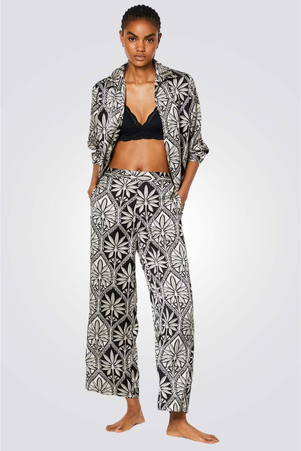 מכנסי פיג'מה לנשים מבית המותג הצרפתי ETAM עשויה בד סאטן עדין בגזרה ישרה ארוכה עם הדפס פרחוני בצבעים שחור לבן.