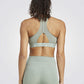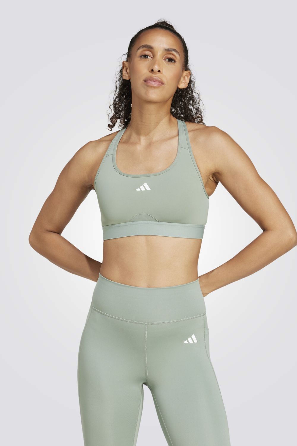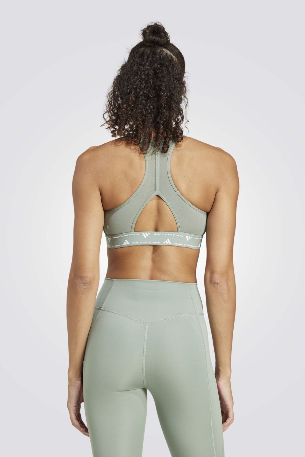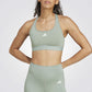 גוזיית ספורט מבית המותג ADIDAS לנשים בצבע ירוק, עשויה בטכנולוגיה AEROREADY מנדף זיעה, רצועות אחוריות עשויות מבד רשת לאוורור, ריפוד נשלף וסמל המותג מקדימה בצבע לבן.
