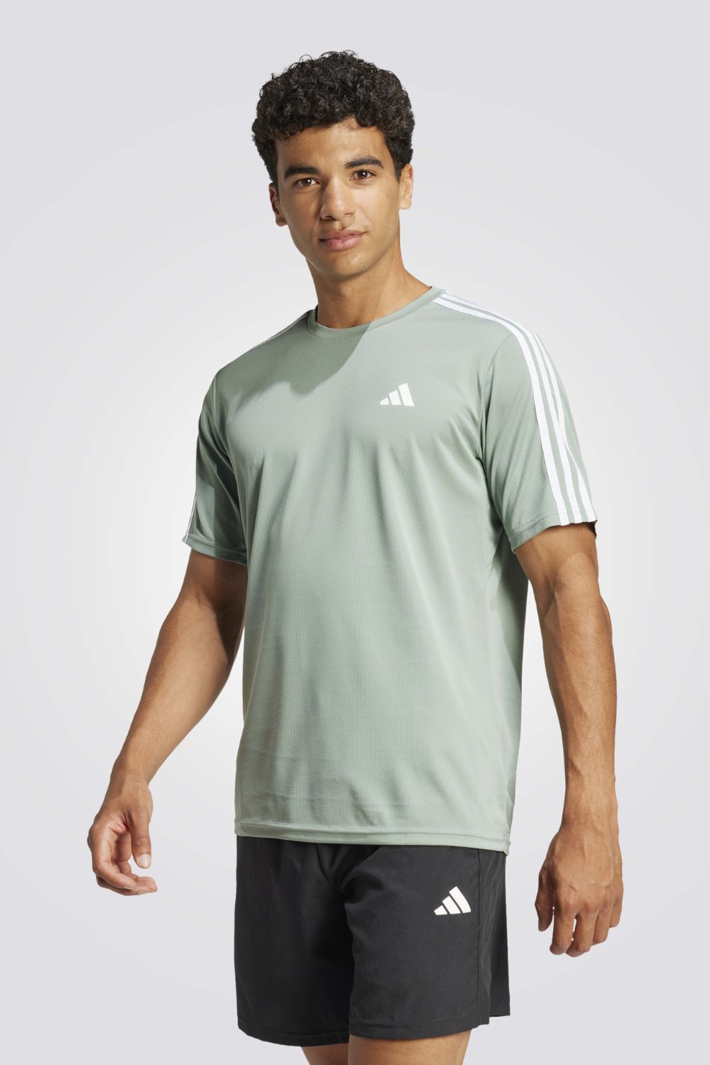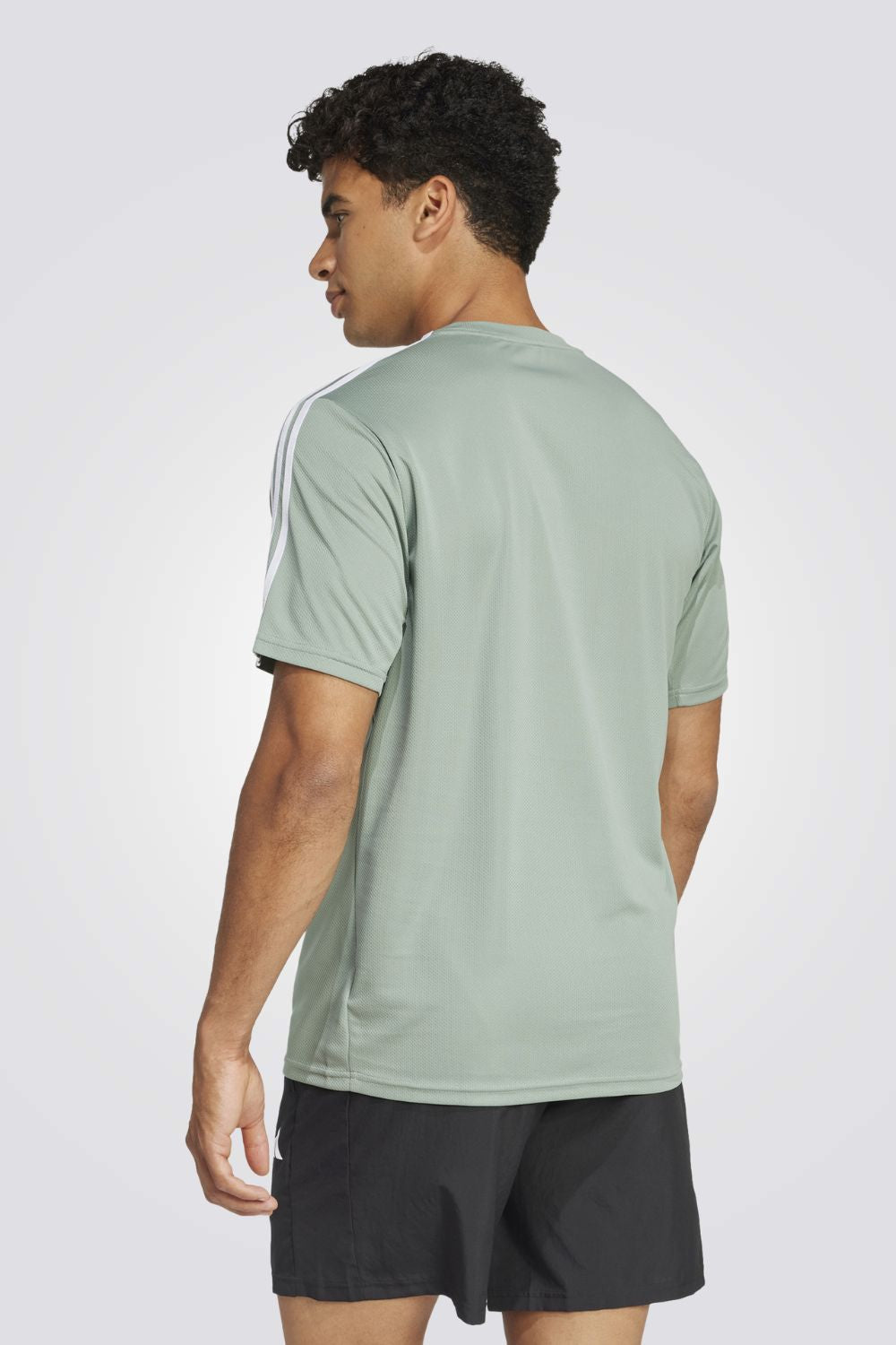 חולצת ספורט מבית המותג ADIDAS לגברים בצבע ירוק בהיר, מבד קליל ונוח, בטכנולוגיה Aeroready מנדף זיעה, צווארון עגול ושלושה פסים בצבע לבן בצידי השרוולים.