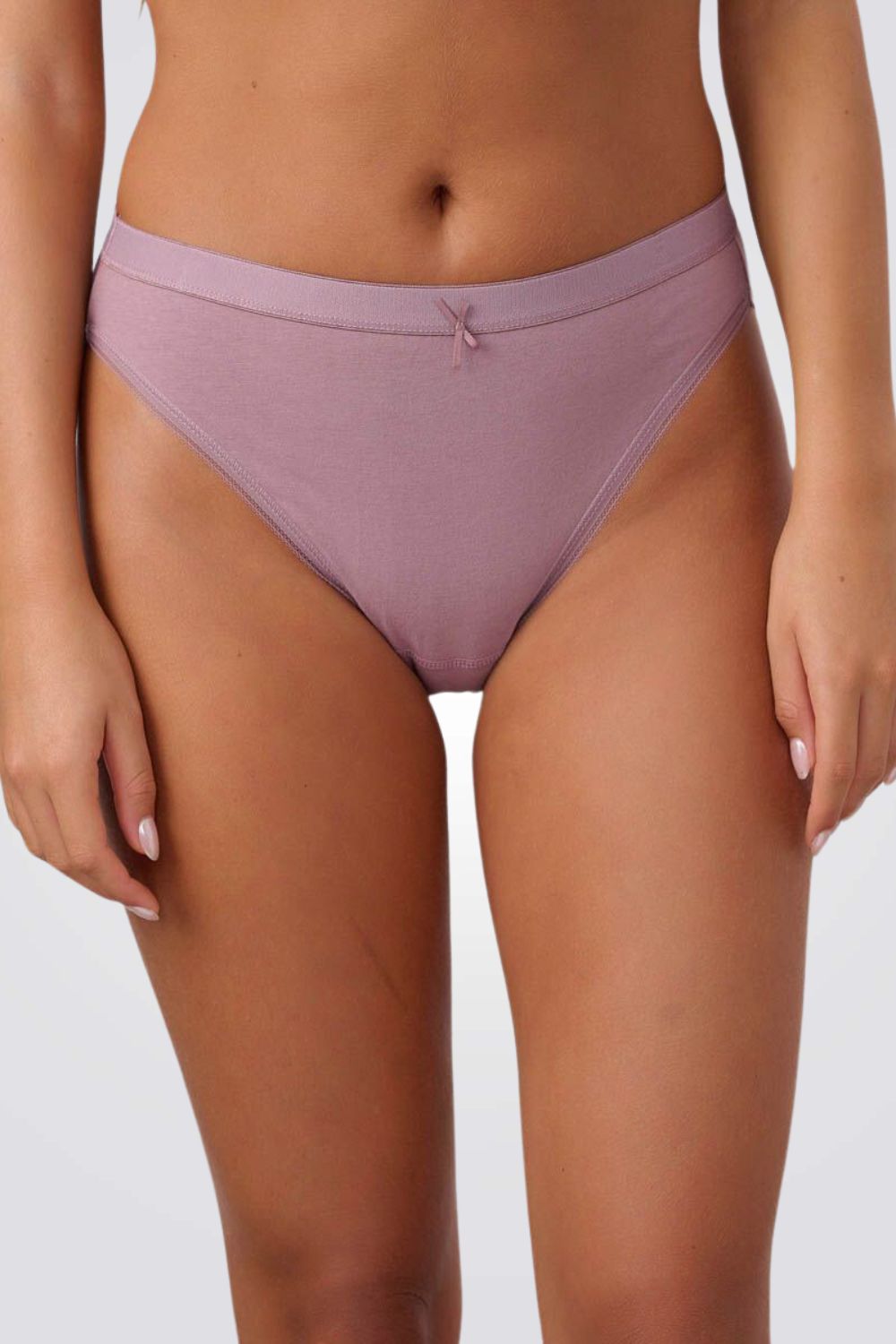 תחתוני ביקיני מבית המותג FEMINA לנשים בצבע סגול מעושן, בגזרת היי לג מחמיאה המאריכה את הרגליים ומדגישה את קווי הגוף בעדינות, עשויים מבד רך ואיכותי המעניק תחושת נוחות מקסימלית ושומר על העור לאורך היום, מעוצבים עם עיטורי תחרה אלגנטיים המוסיפים טאץ' נשי ורומנטי.