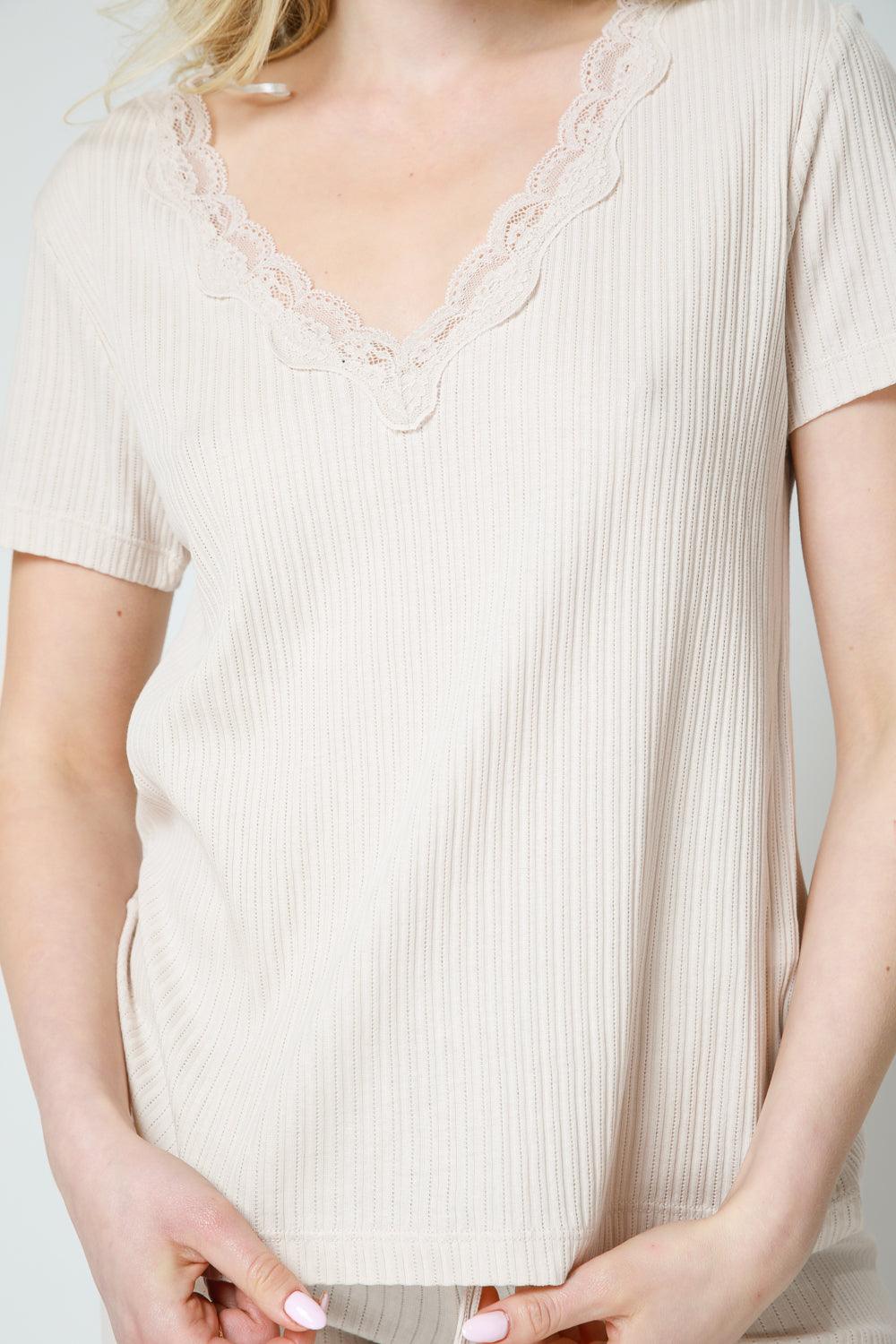 חולצת V קצרה בגימור תחרה קרם
