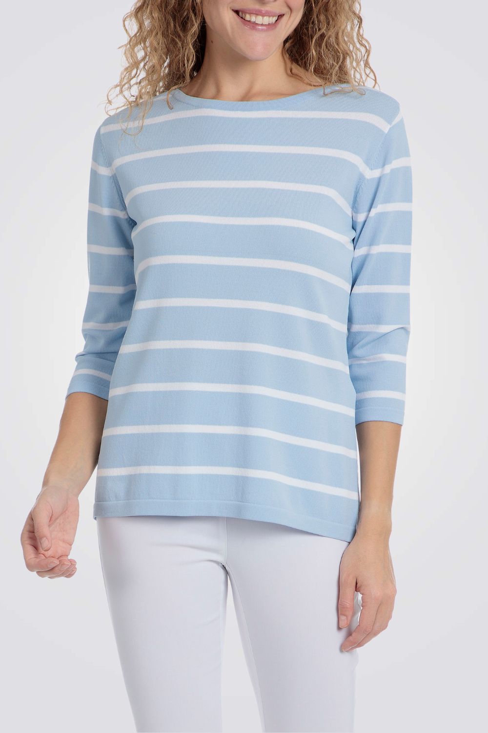 סריג לנשים מבית המותג PUNT ROMA, עם הדפס פסים בצבע תכלת/לבן, בעל שרוולי שלושת רבעי וצווארון עגול.