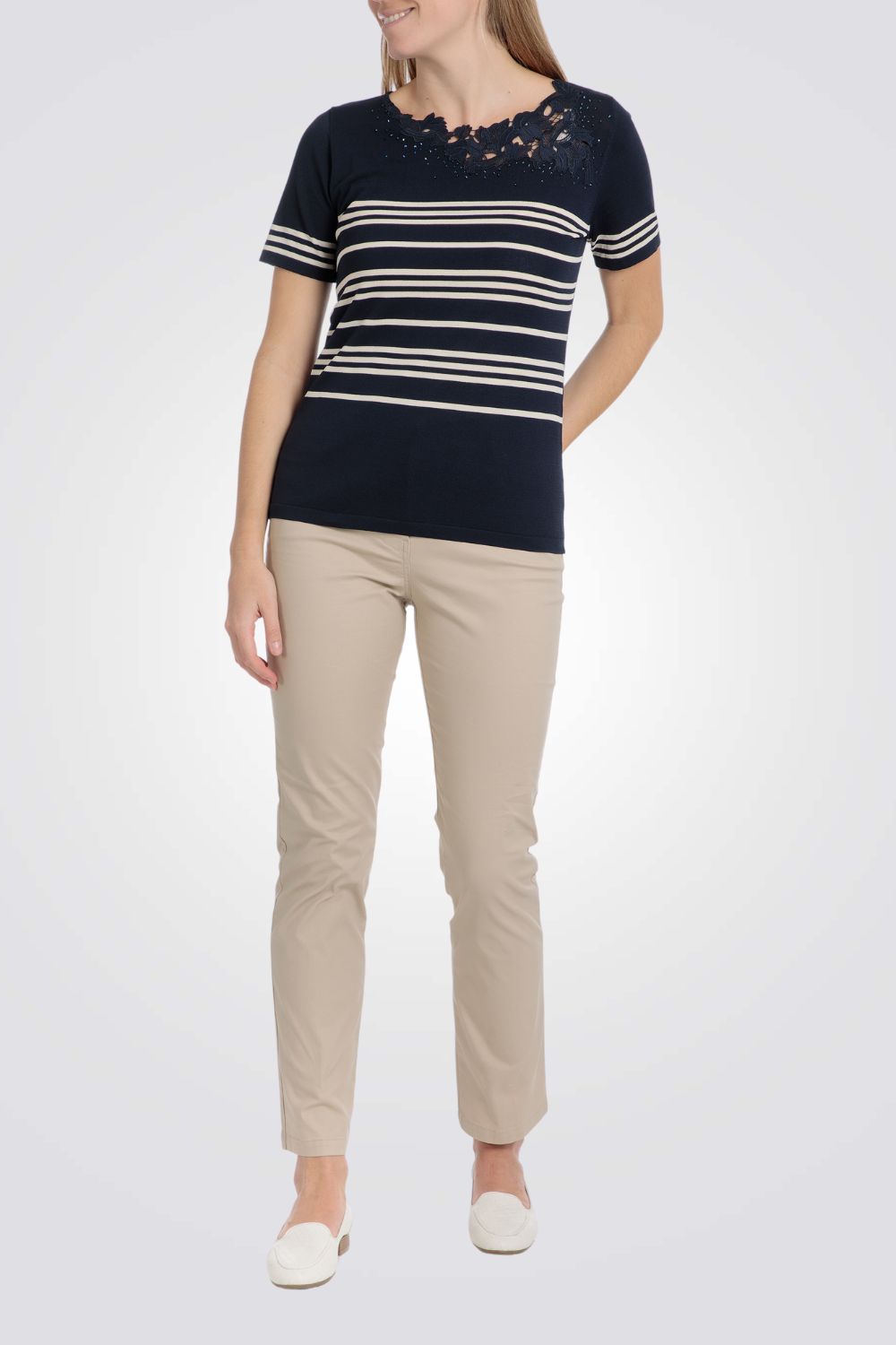 סריג לנשים מבית המותג PUNT ROMA, עם הדפס פסים בצבעי נייבי/לבן, בעל שרוולים קצרים, צווארון עגול בשילוב דיטיילס רקומים ואבני חן לעיטור.