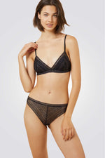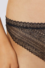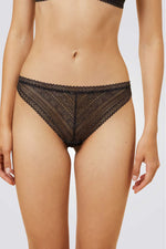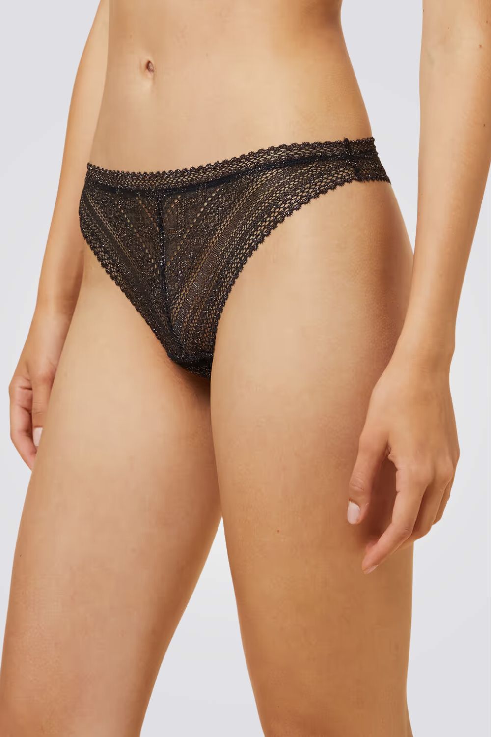 תחתונים לנשים מבית המותג הצרפתי ETAM, בגזרת טנגה ועשויים בד תחרה שחור נוצץ עם בטנת כותנה לתחושת נוחות מקסימלית במהלך היום.
