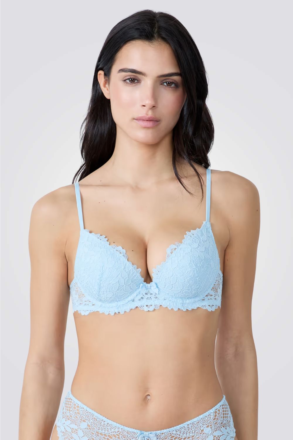 חזיית פוש אפ מבית המותג ETAM בעל ברזלי תמיכה, רצועות מתכווננות להתאמה מקסימלית ובעיצוב תחרה פרחונית בכל איזורי החזייה ופפיון קטן במרכז.