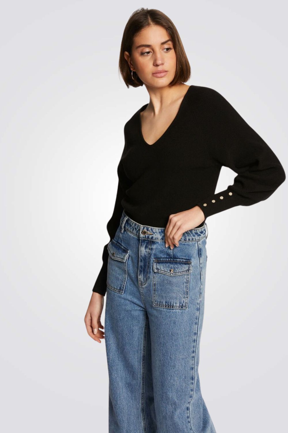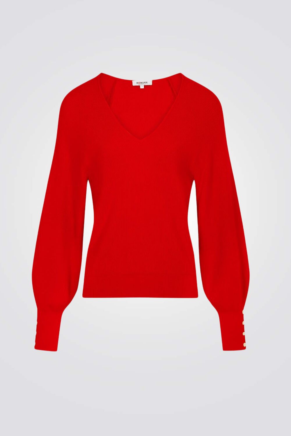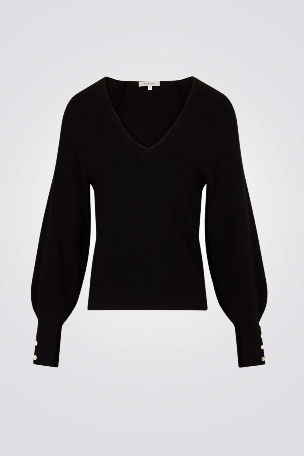חולצת סריג מבית המותג MORGAN עם שרוולים ארוכים ונפוחים בשילוב כפתורים דקורטיביים וצווארון וי עמוק.