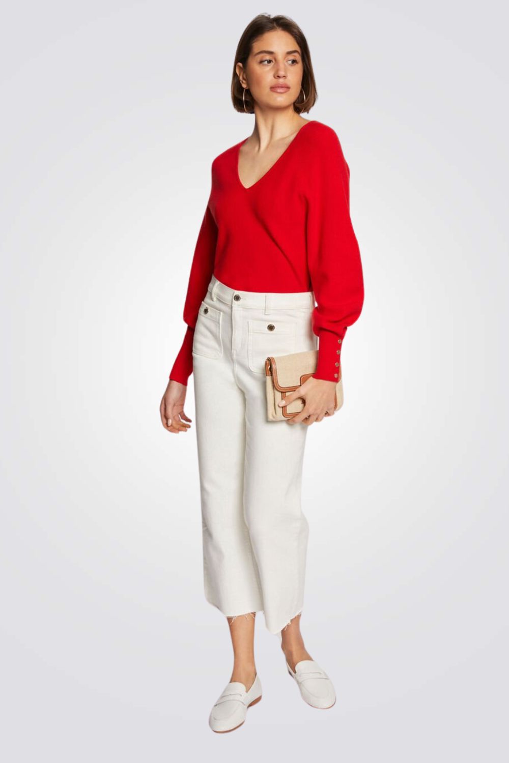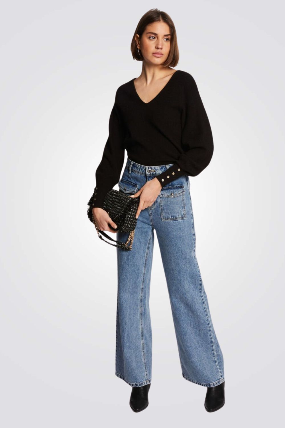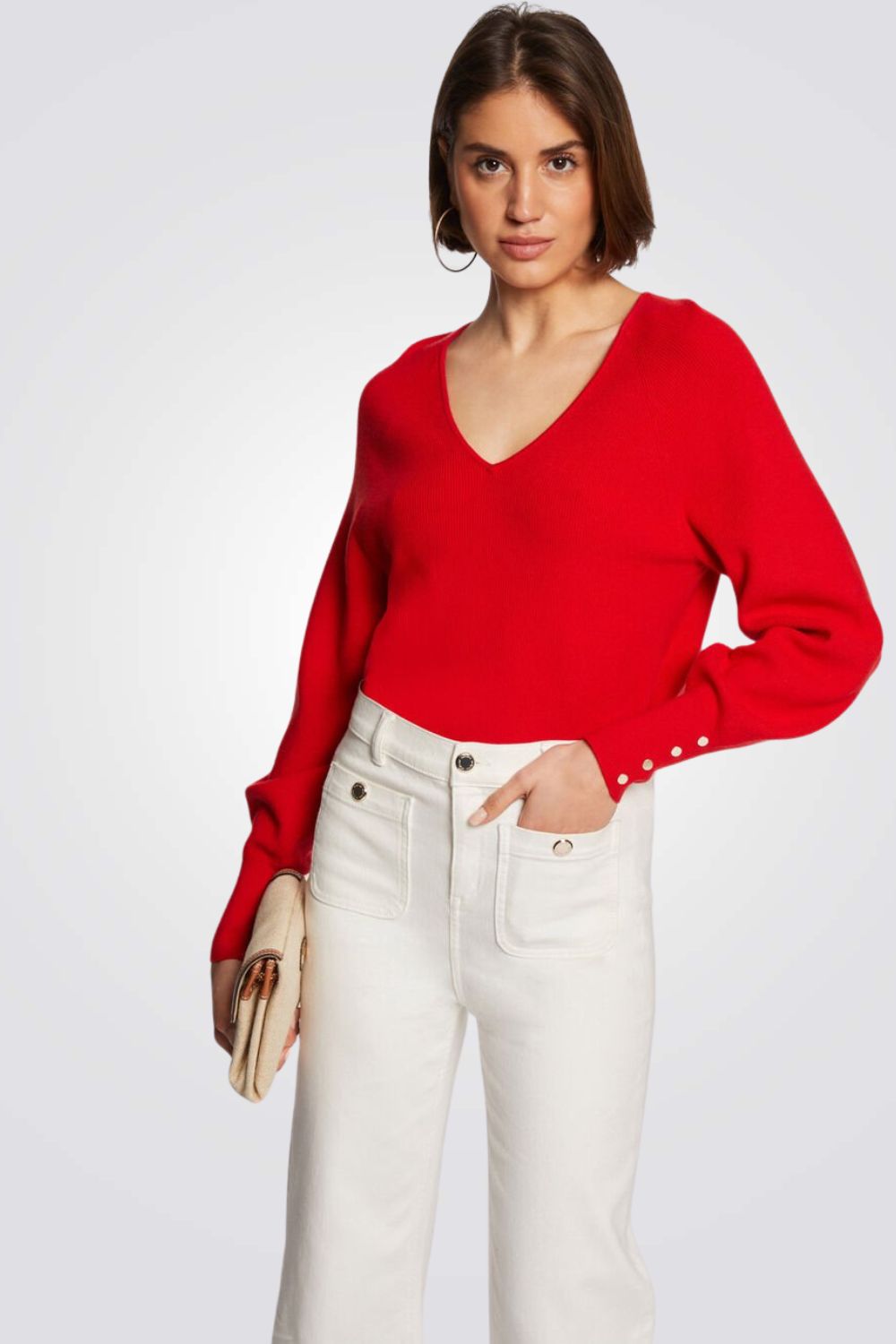 חולצת סריג מבית המותג MORGAN עם שרוולים ארוכים ונפוחים בשילוב כפתורים דקורטיביים וצווארון וי עמוק.