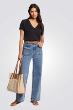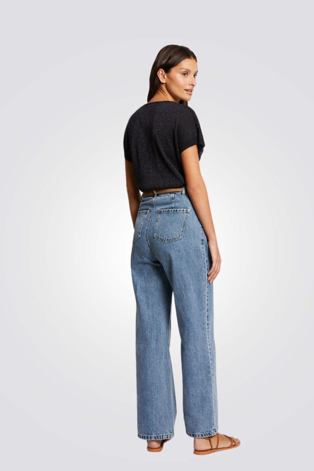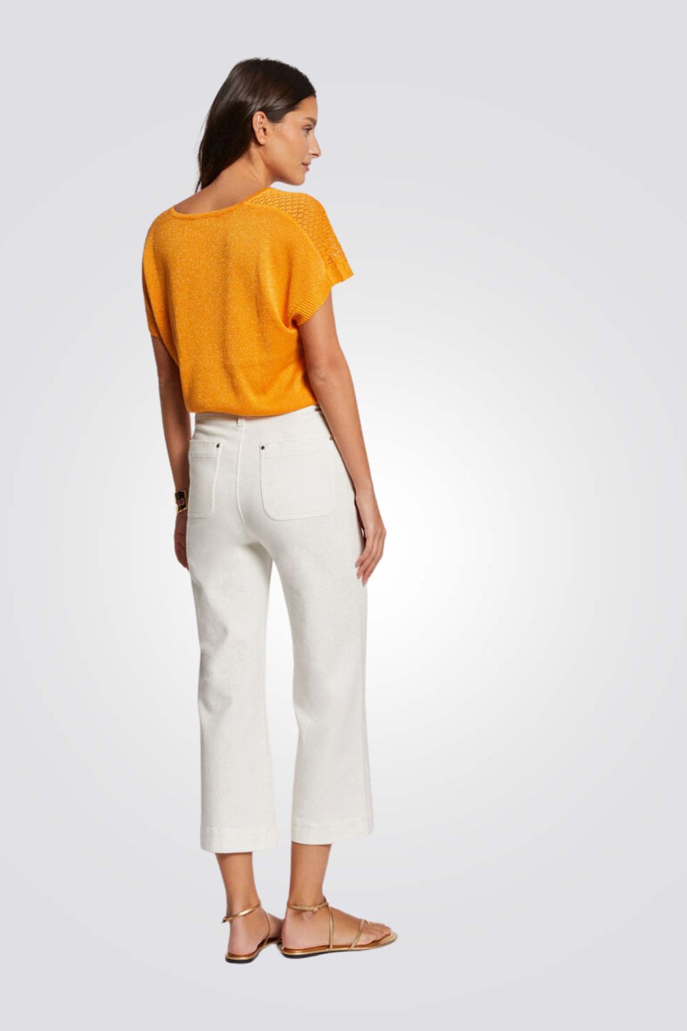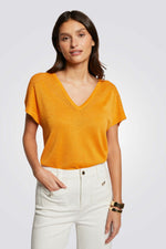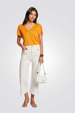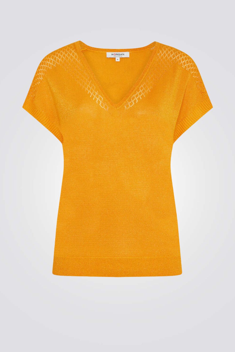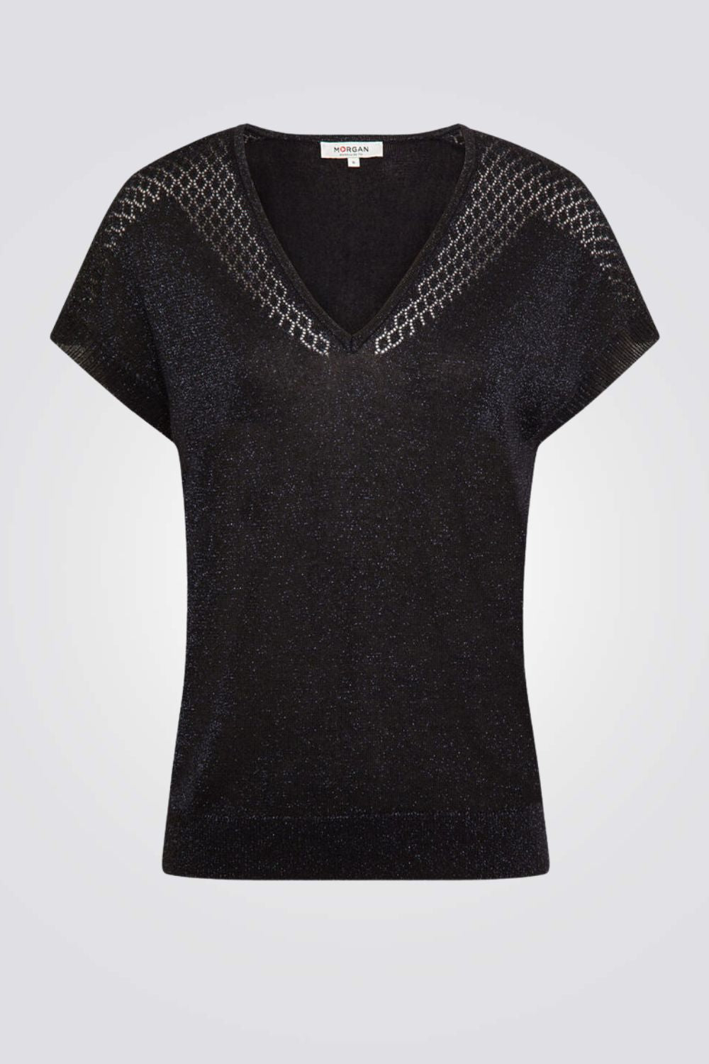 חולצה מבית המותג MORGAN, עם צווארון V, ופרטים פתוחים על הכתפיים.