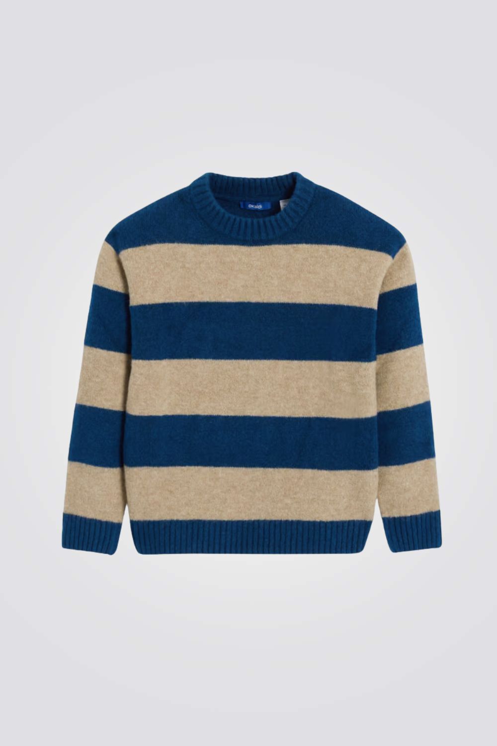 סוודר לילדים מבית המותג OKAIDI, מחמם ונעים עם צווארון עגול ופסים בצבע כחול ובז', סיומת מעט צמודה בסוף השרוולים ומתחתית הסוודר.