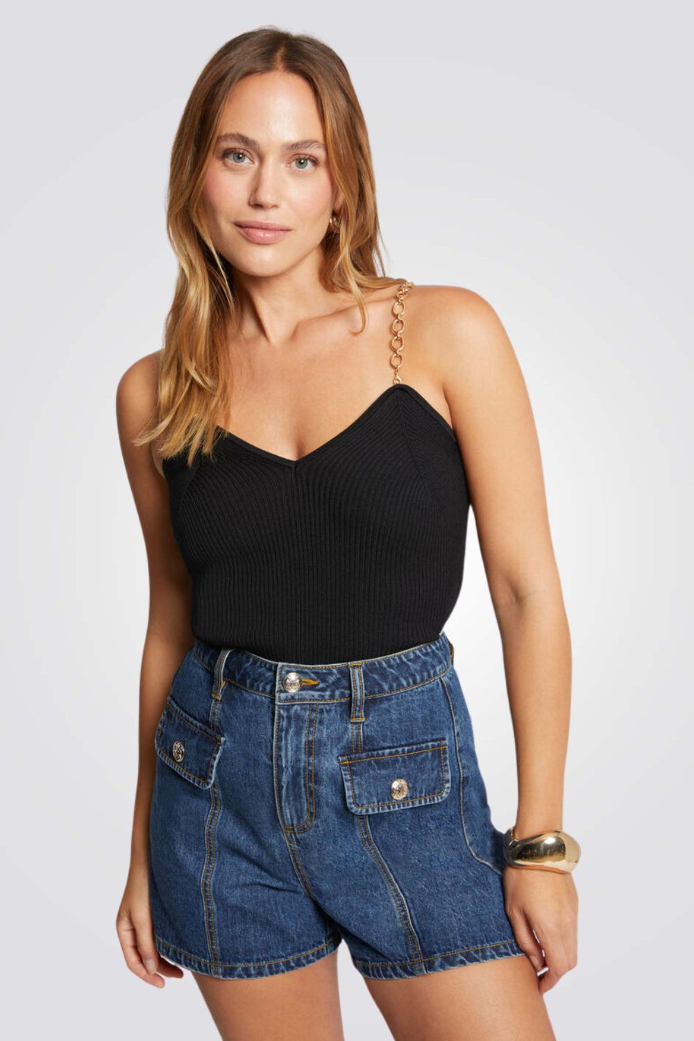 טופ סרוג מבית המותג MORGAN מגיעה בשלושה צבעים, בעל מחשוף V, כתפיות מתכת זהובות ובגזרה עם גב פתוח.