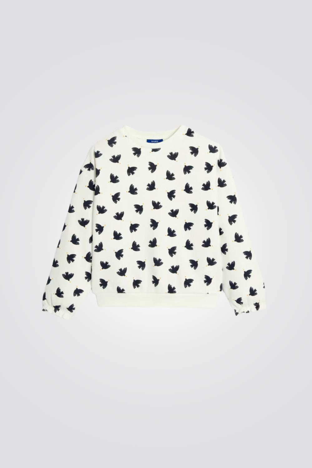 סווטשירט לילדות מבית המותג OKAIDI, בצבע לבן עם הדפס ציפורים , רך מחמם ונעים, עם שרוולים ארוכים וסיומת גומי, וצווארון עגול.