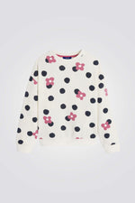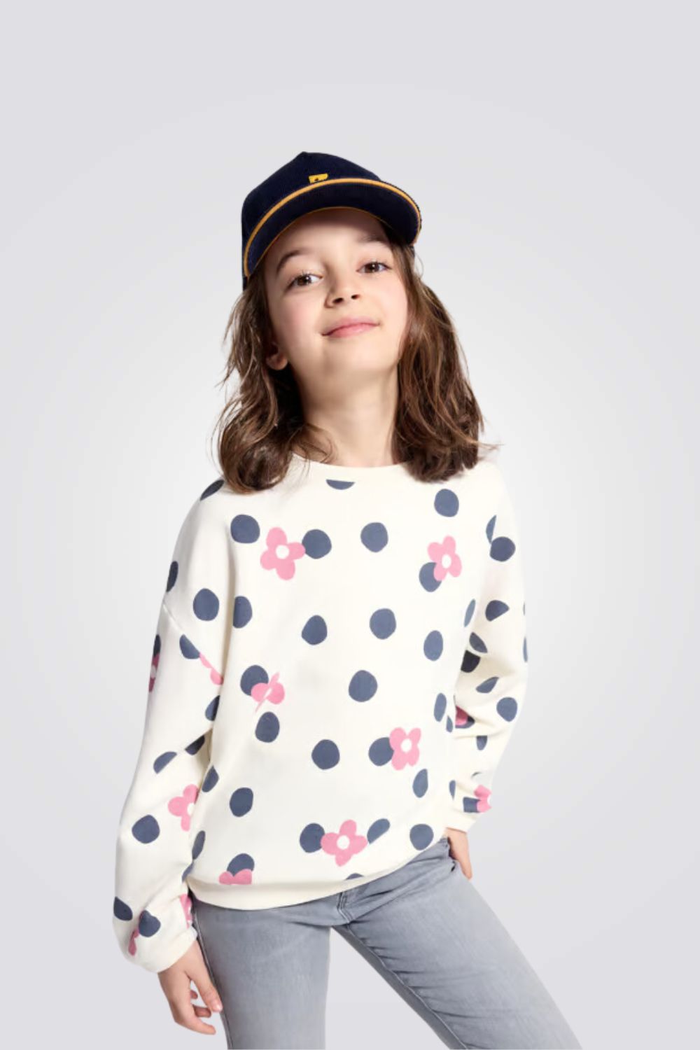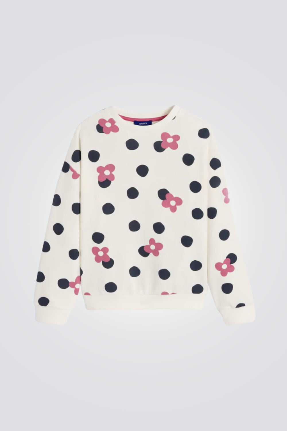סווטשירט לילדות מבית המותג OKAIDI, עם הדפס נקודות ופרחים, מחמם ונעים ,מתאים ליום יום, עם צווארון עגול.