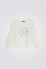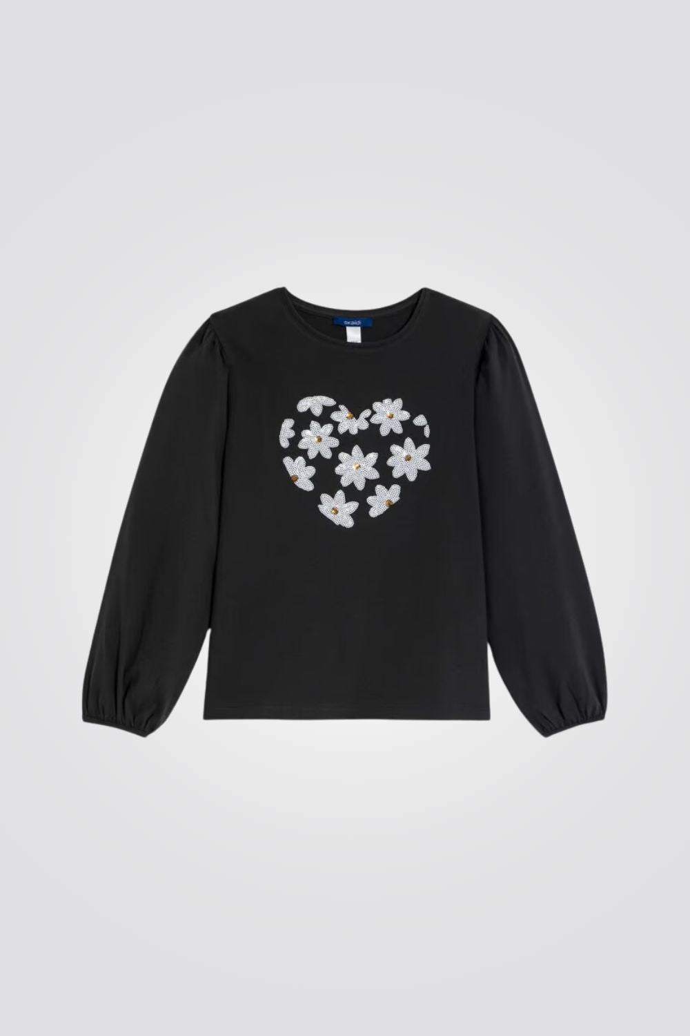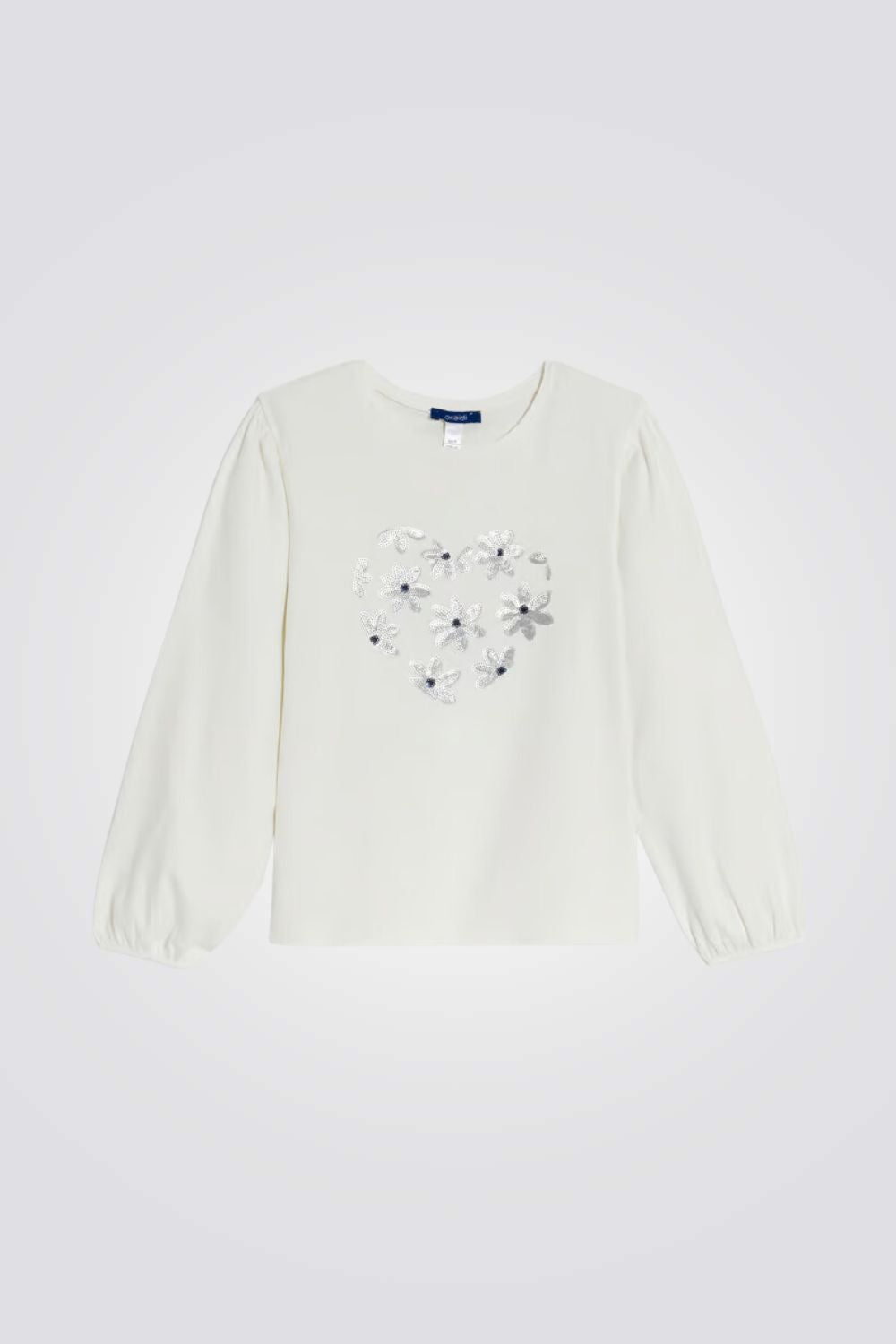 טישירט לילדות מבית המותג OKAIDI, עם שרוולים ארוכים וצווארון עגול, עשויה מבד קליל ונוח, עם עיטורי פאייטים .