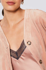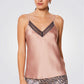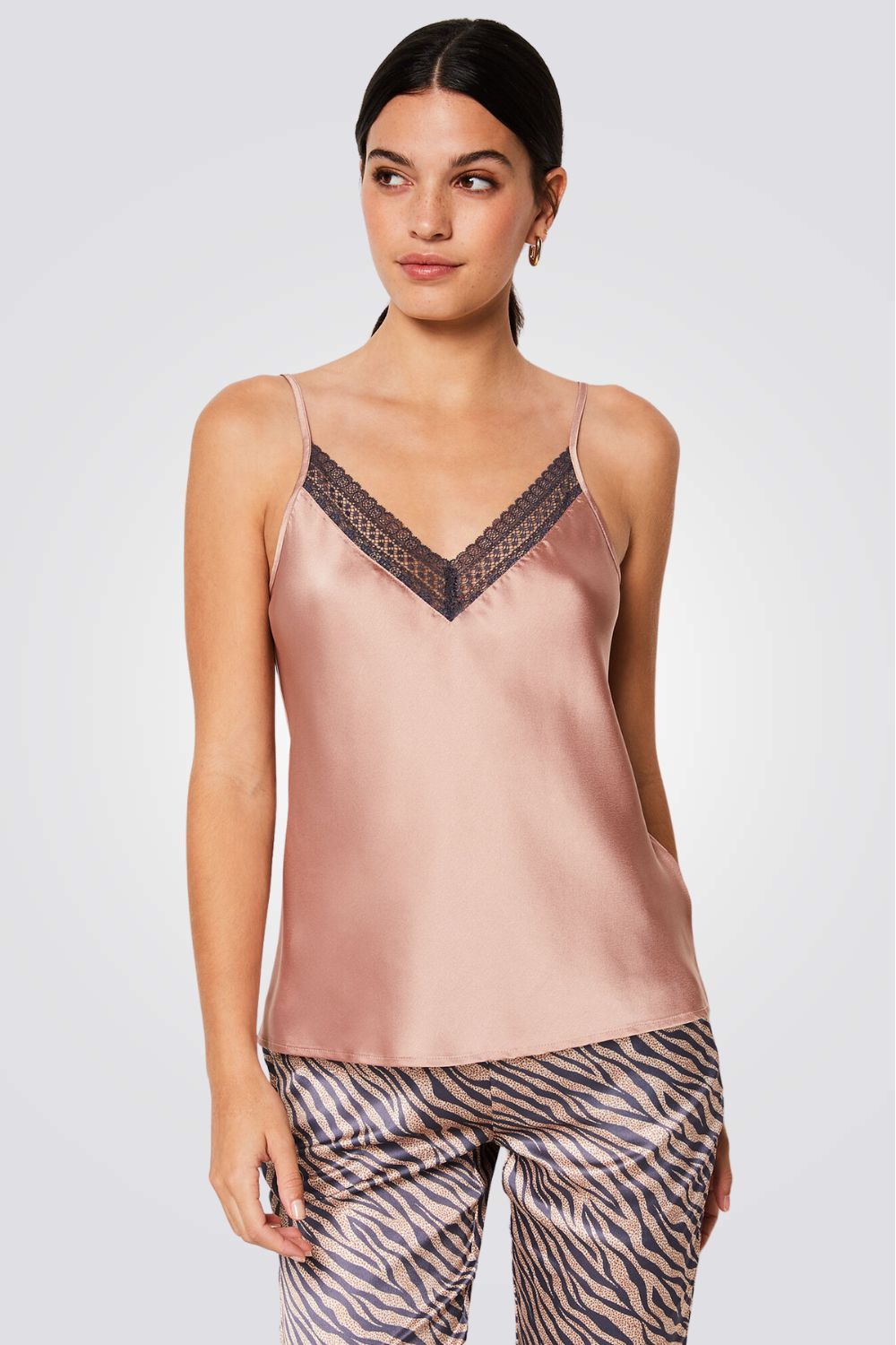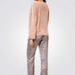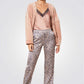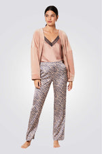 סט פיג'מה ארוכה מבית המותג ETAM העשויים בד פוליאסטר רך ונעים, הסט מורכב מגופיית סאטן עם תחרה שחורה בקו החזה, מכנסיים ארוכים בהדפס מנומר עם רצועת מותן אלסטית וג'קט בצבע התואם לגופייה עם סגירת כפתורים קידמית.