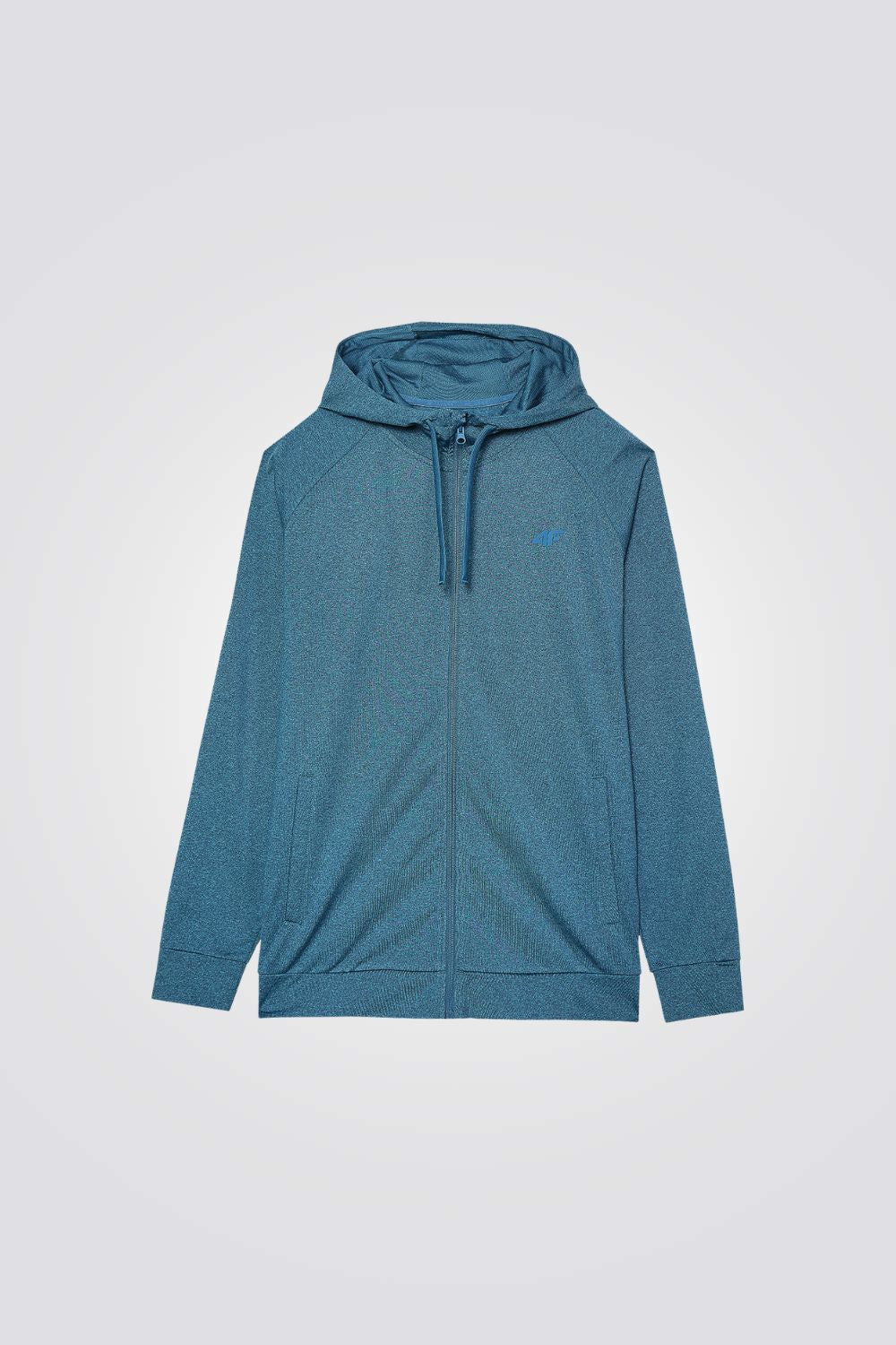 סווטשירט קפוצ'ון לגברים מבית המותג 4F, בצבע טורקיז, עם סגירת רוכסן ושני כיסים צדדיים.