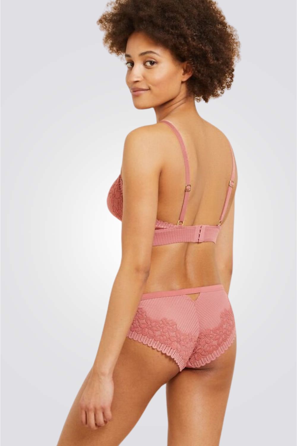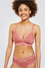 חזיית משולשים מבית המותג ETAM. קאפים מעוטרים בתחרה פרחונית, ללא ברזל וללא ריפוד, רצועה אלסטית רחבה תומכת מתחת לחזה, כתפיות מתכווננות וסגירת קרסים אחורית.