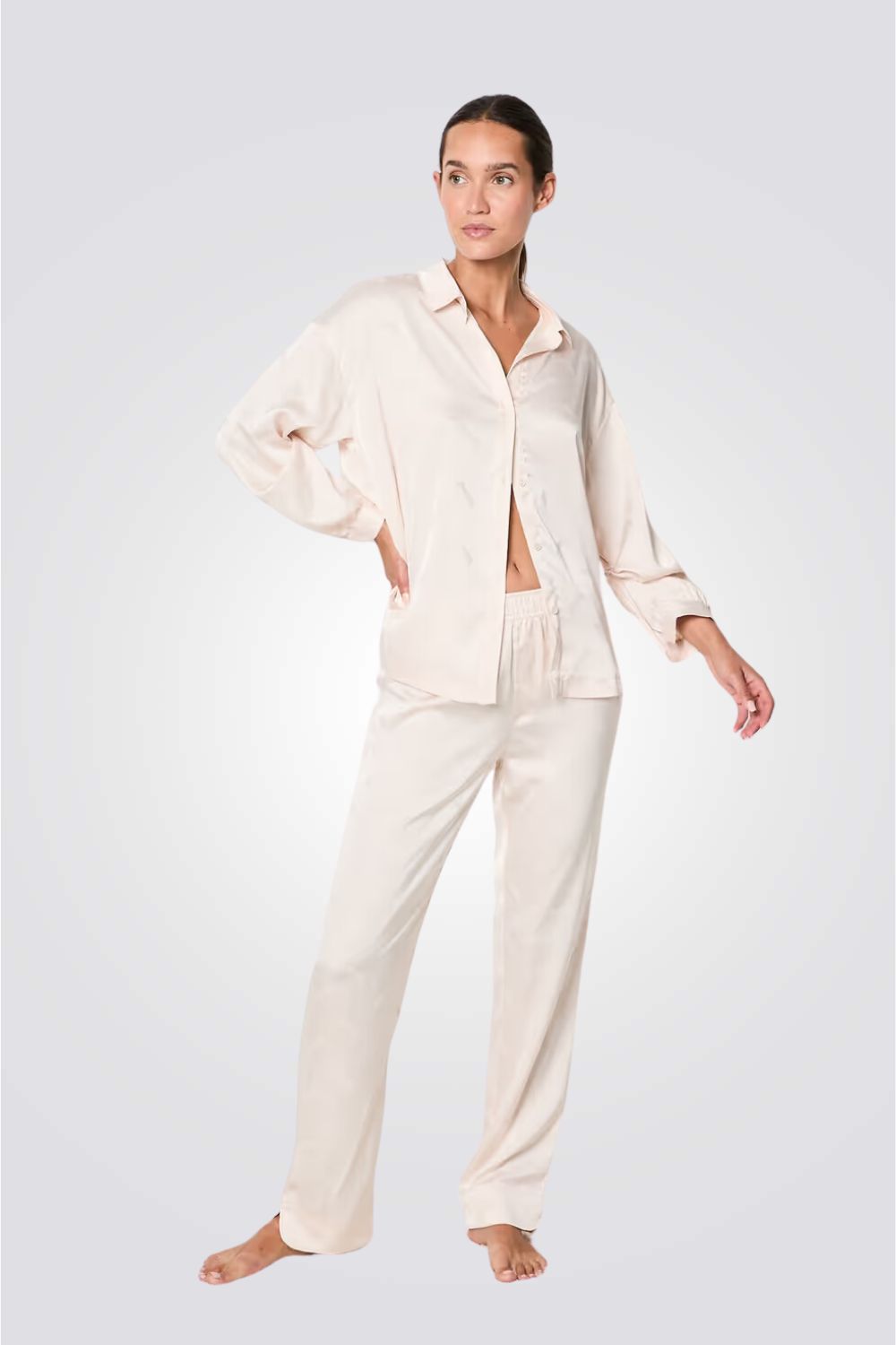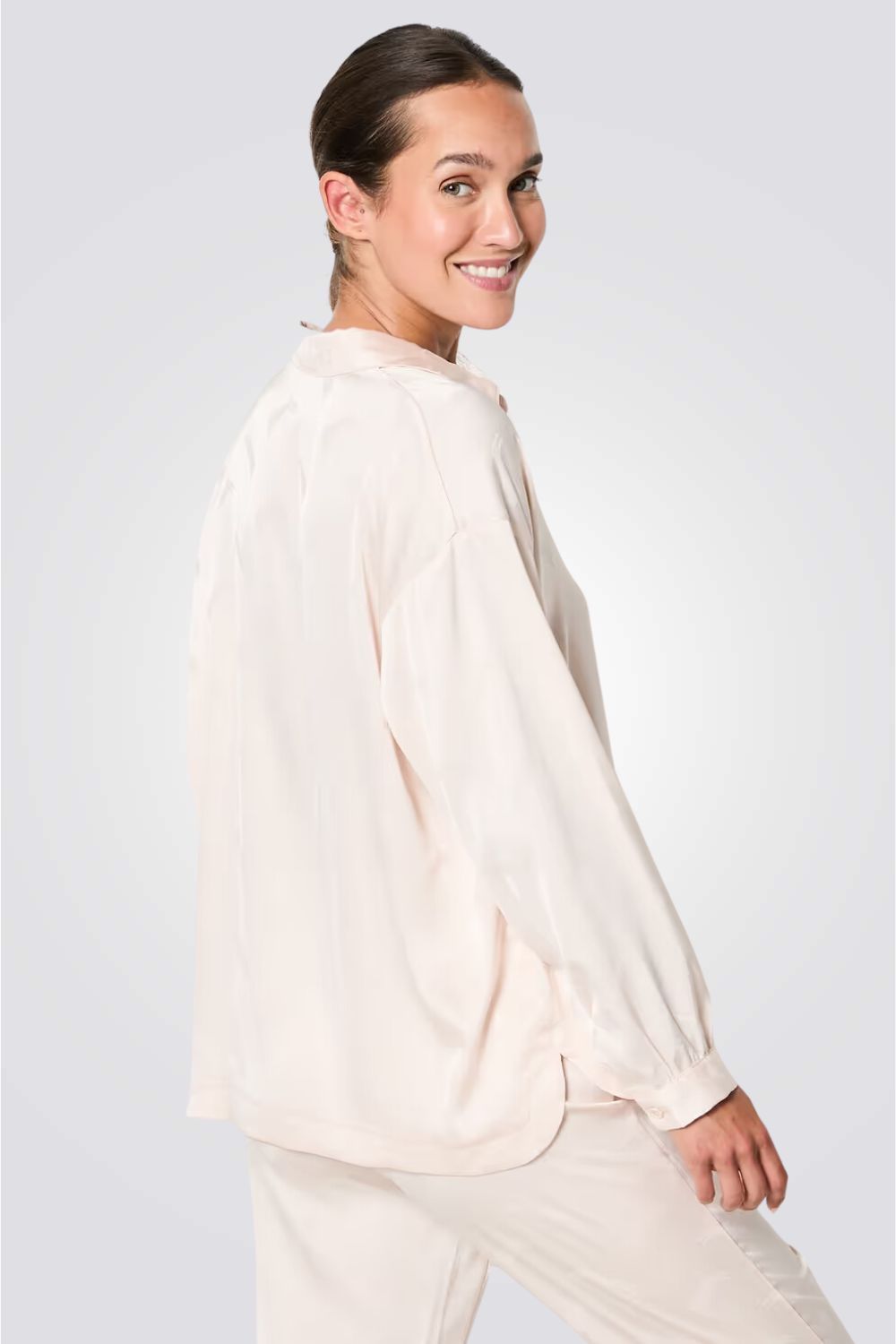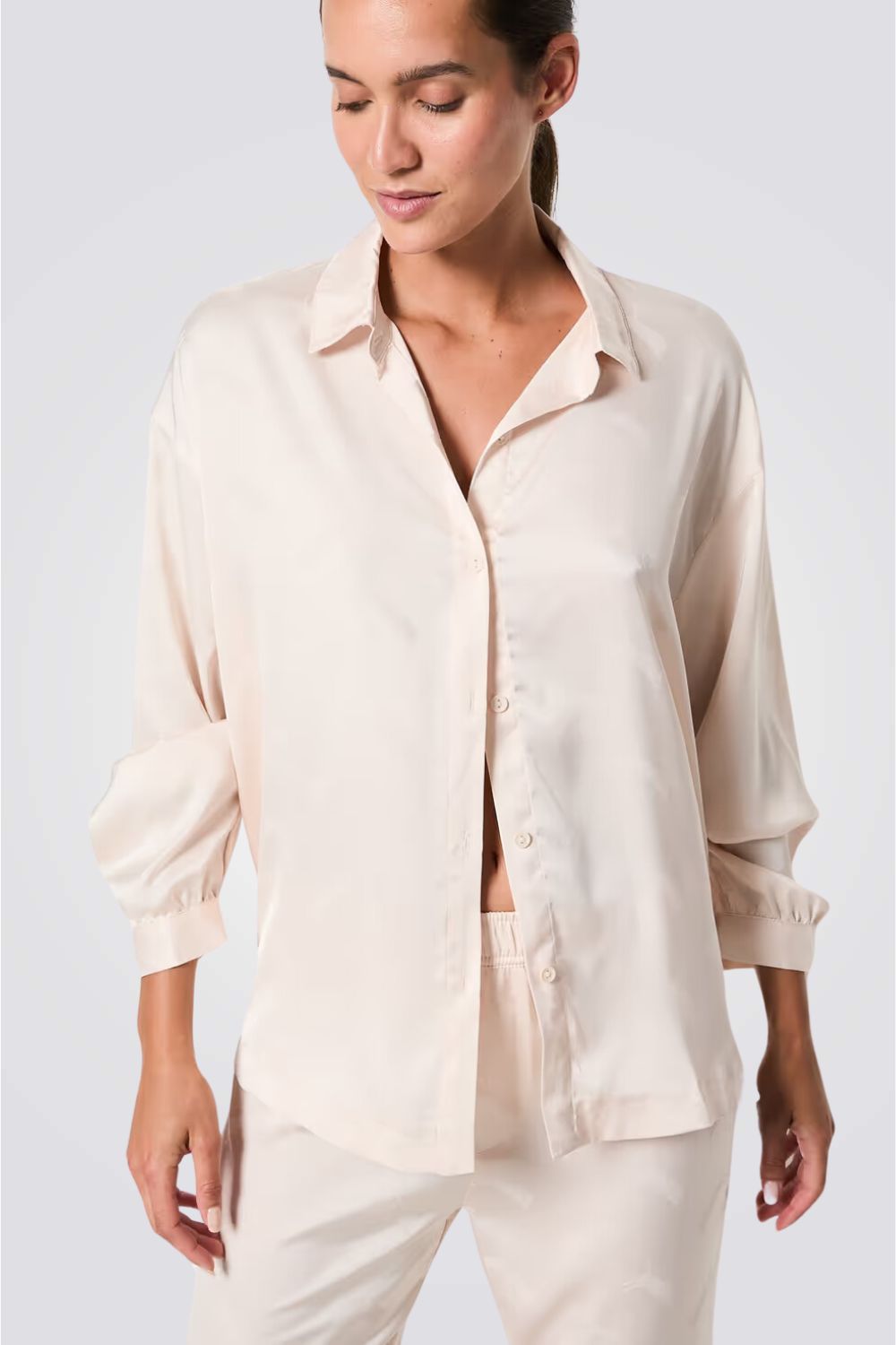 חולצת פיג'מה מכופתרת מבית המותג הצרפתי ETAM, עשוייה מבד סאטן רך ונעים, שרוולים ארוכים ונפוחים, צווארון דש וסגירת כפתורים קידמית