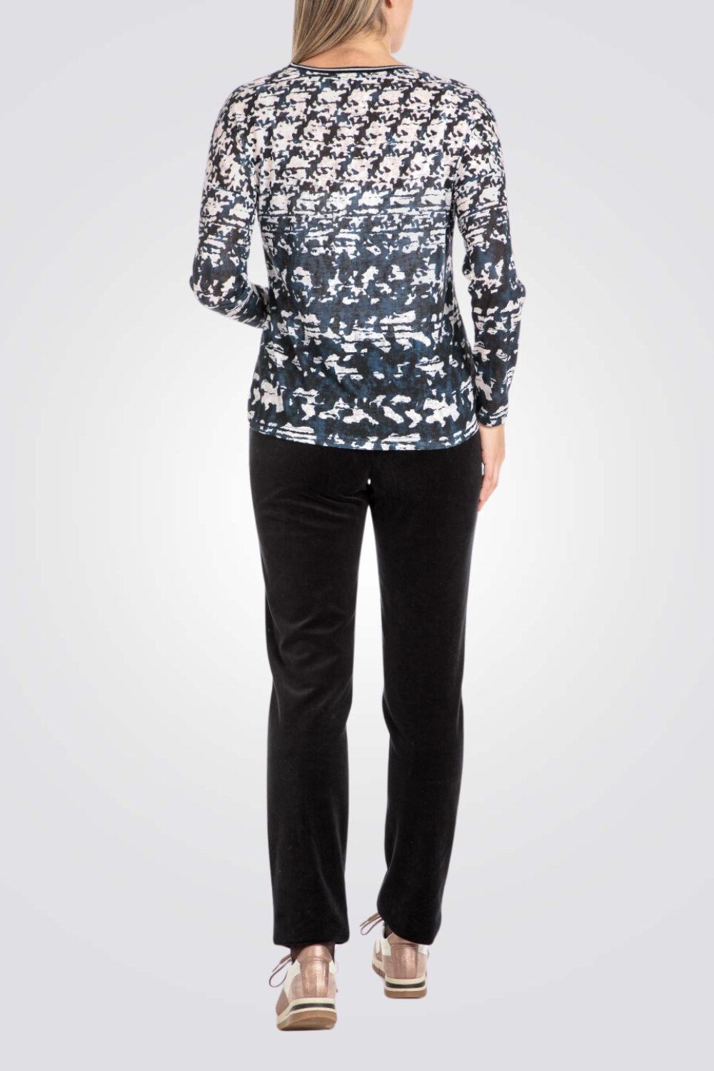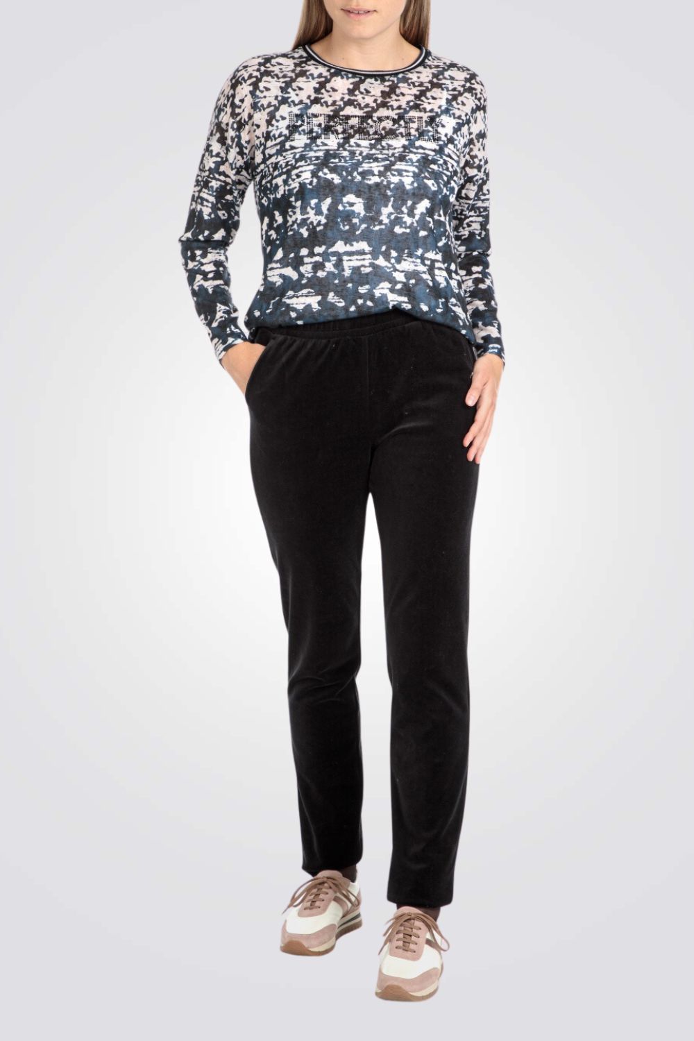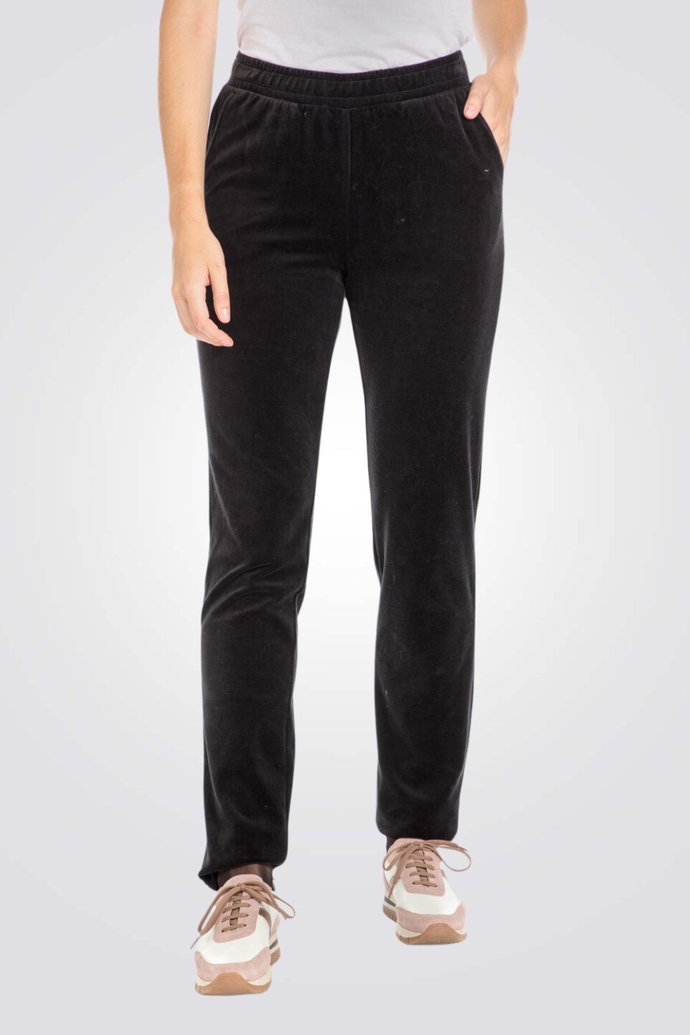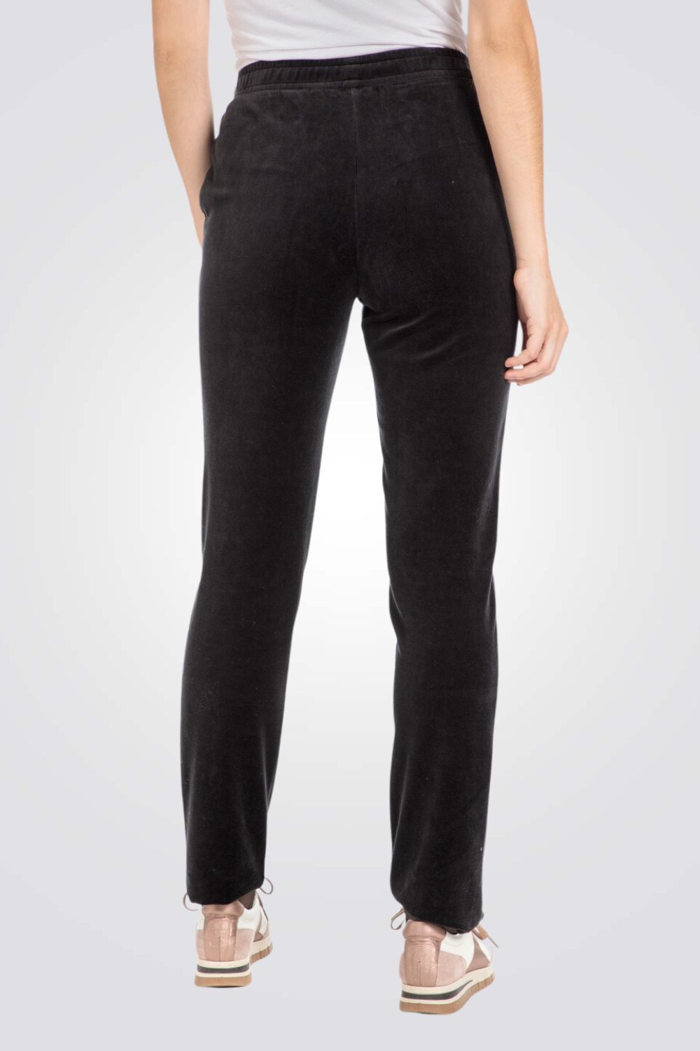 מכנסיים ארוכים לנשים מבית המותג PUNT ROMA בצבע שחור, עם מותן אלסטית בשילוב שרוכים ו-2 כיסים צדדיים.