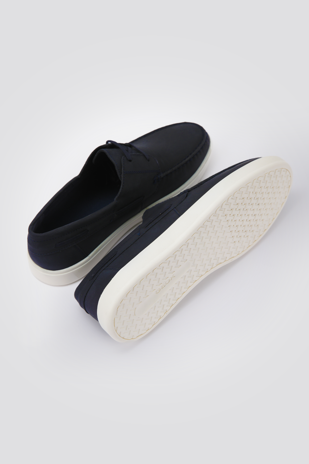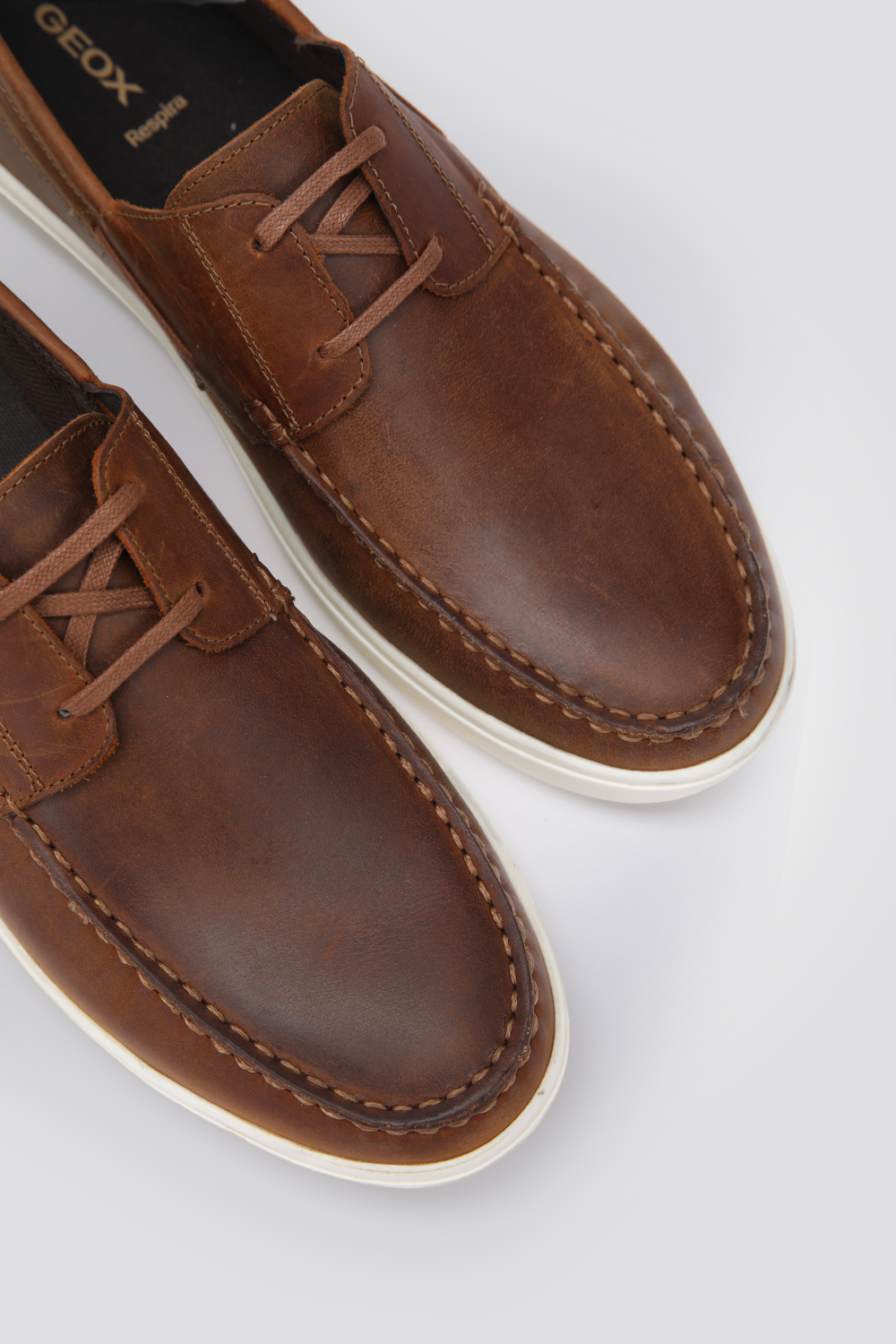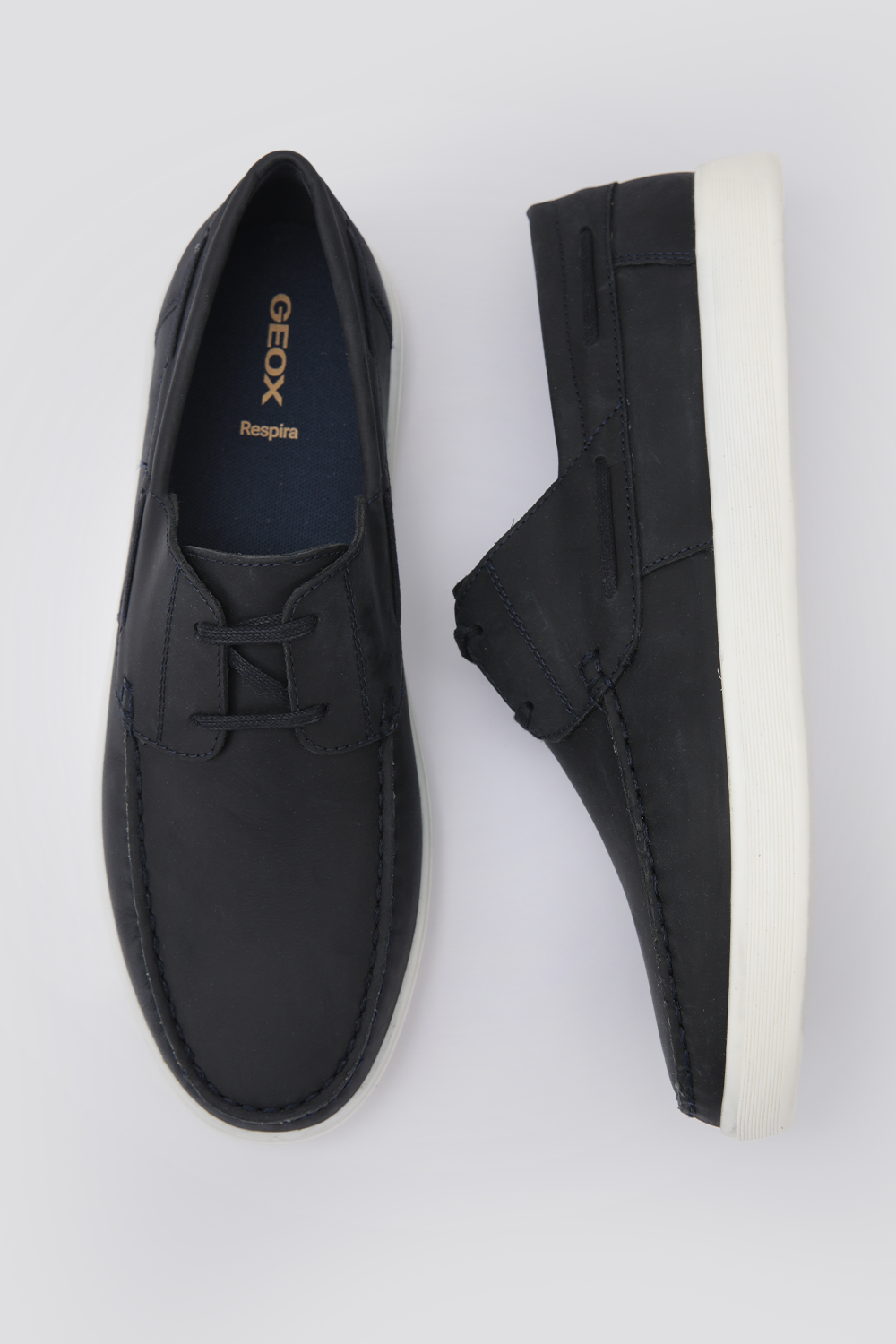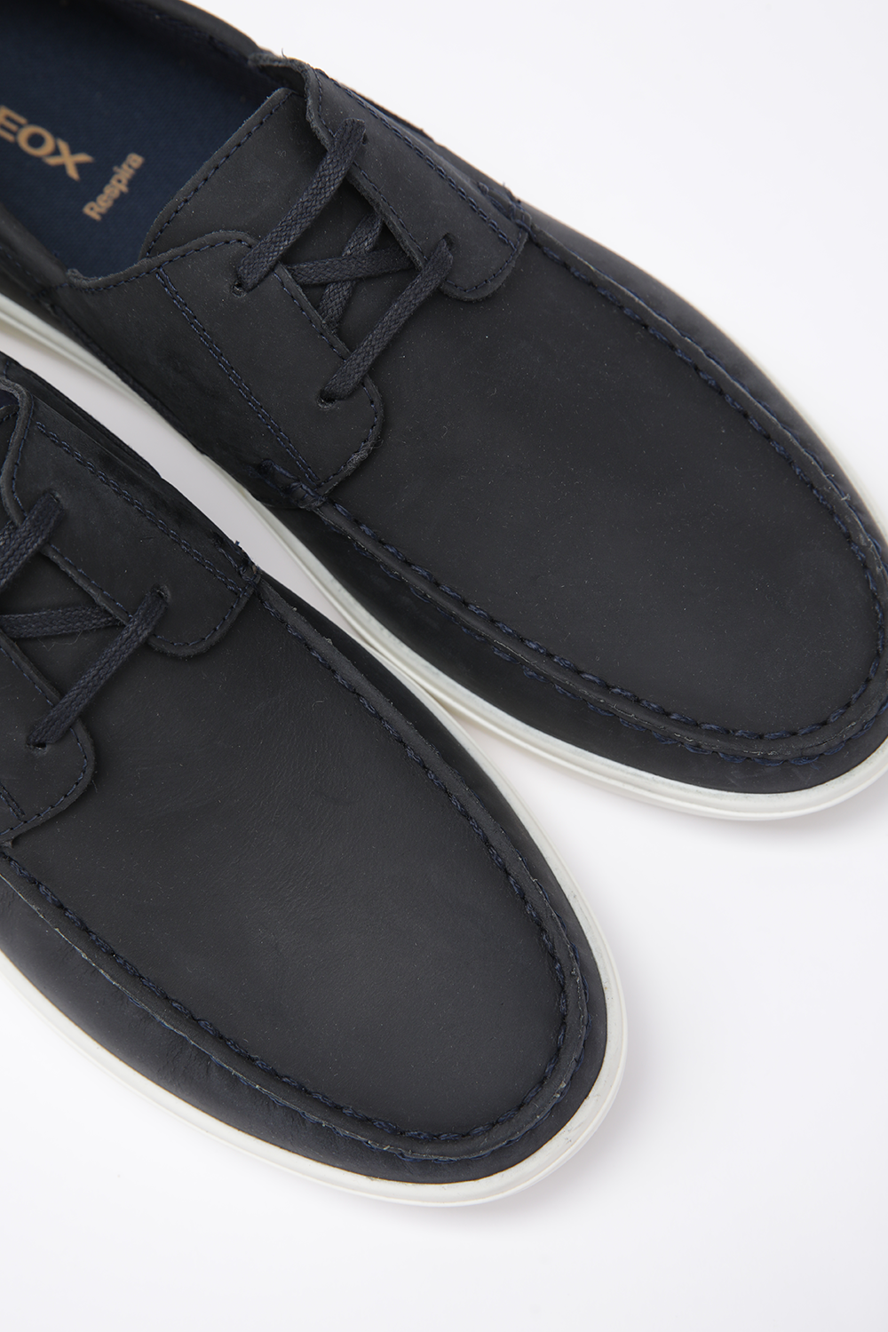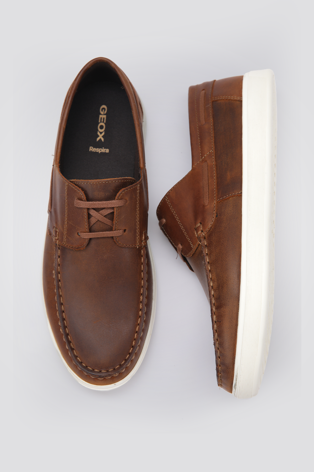 נעלי מוקסין לגברים מבית המותג GEOX מבד עור, נוחות להליכה ומתאימות למגוון אירועים, בעלות עיטור שרוך בצידי הנעל וקשירת שרוכים קצרה מקדימה.