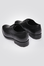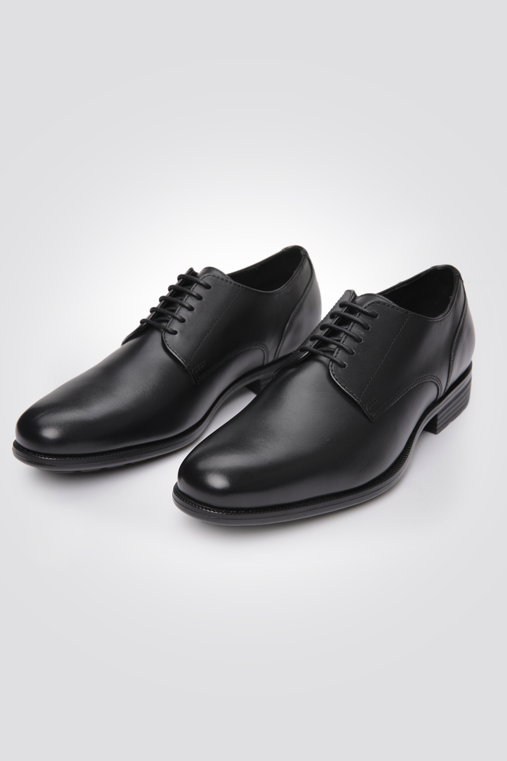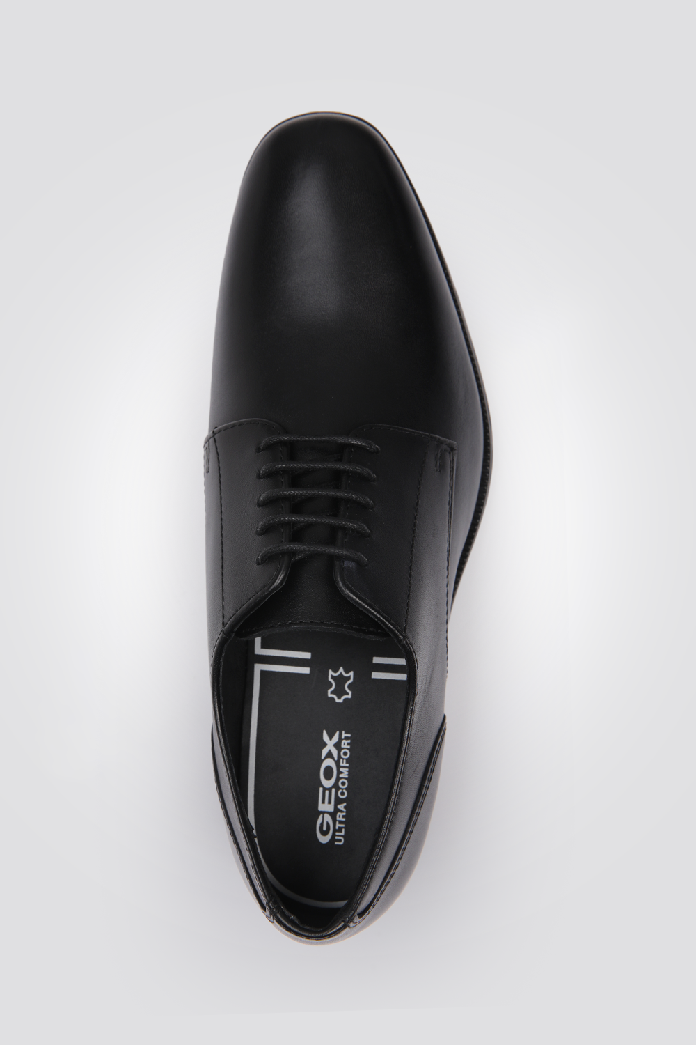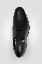 נעליים אלגנטיות לגבר מבית המותג GEOX, בצבע שחור. עקב קטן ושרוכים בחלקה העליון של הנעל.