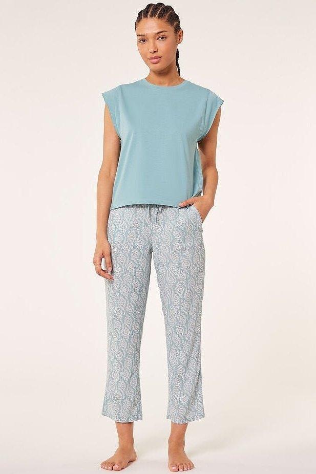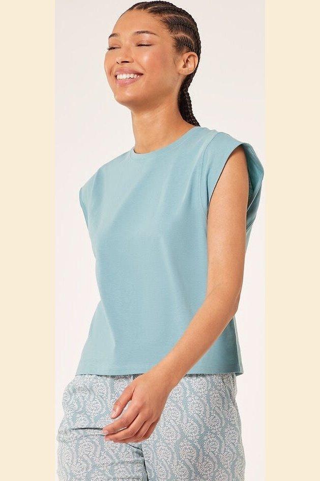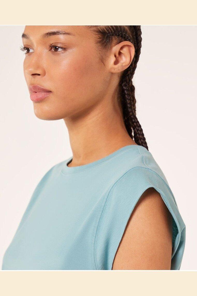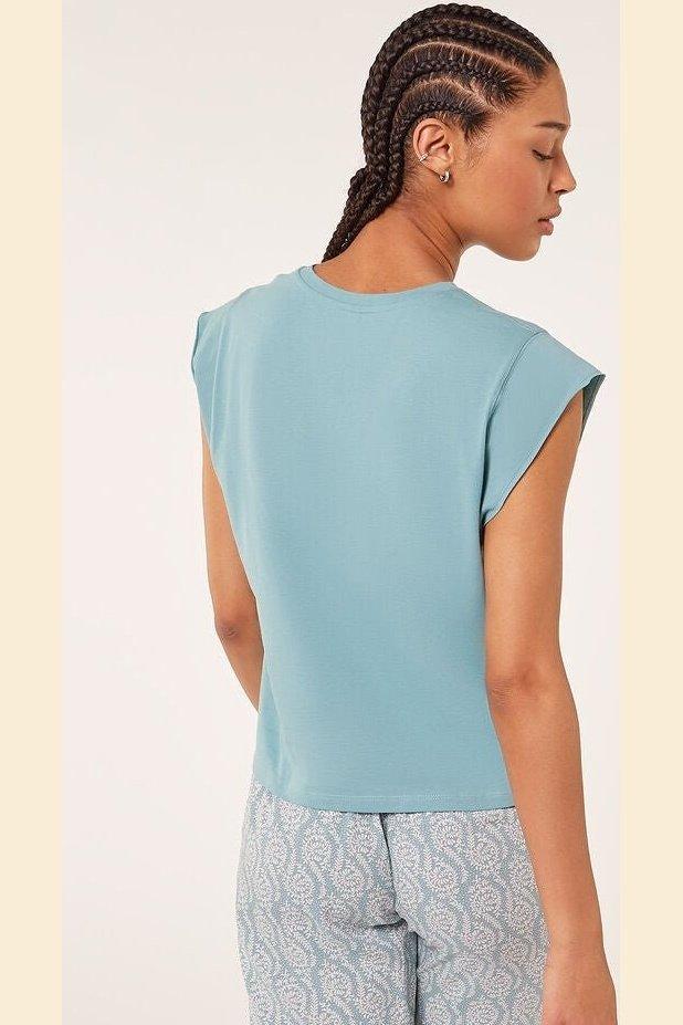 חולצה מבית המותג ETAM מכותנה אורגנית רכה ונעימה במיוחד בגוון תכלת-ירקרק, עם שרוולים באורך חצי במפתח רחב, גיזרה ישרה ונינוחה וצווארון עגול.