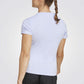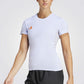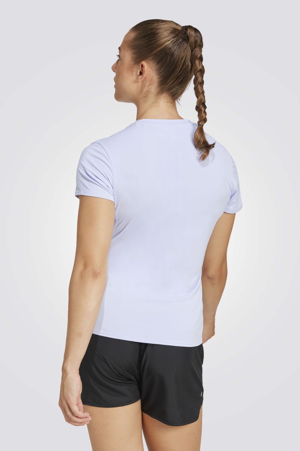 חולצת ספורט מבית המותג ADIDAS לנשים בצבע תכלת בהיר, סמל המותג בצבע כתום בקידמת החולצה, צווארון עגול, שרוולים קצרים ועשוי בטכנולוגיה AEROREADY מנדף זיעה.