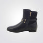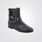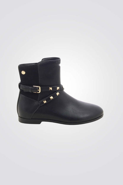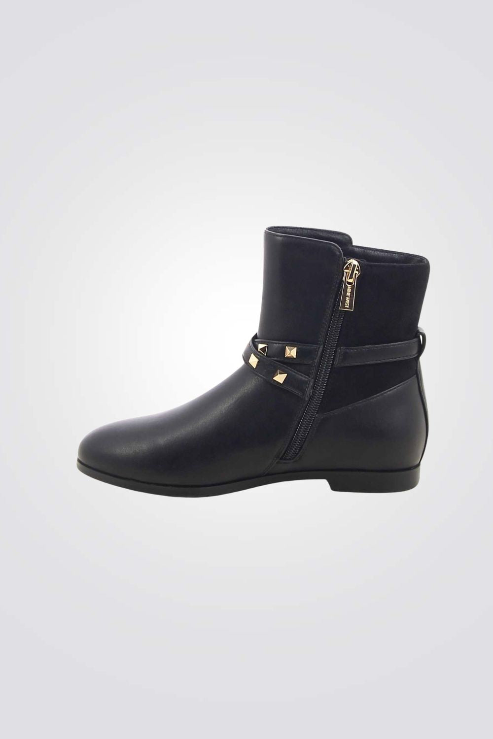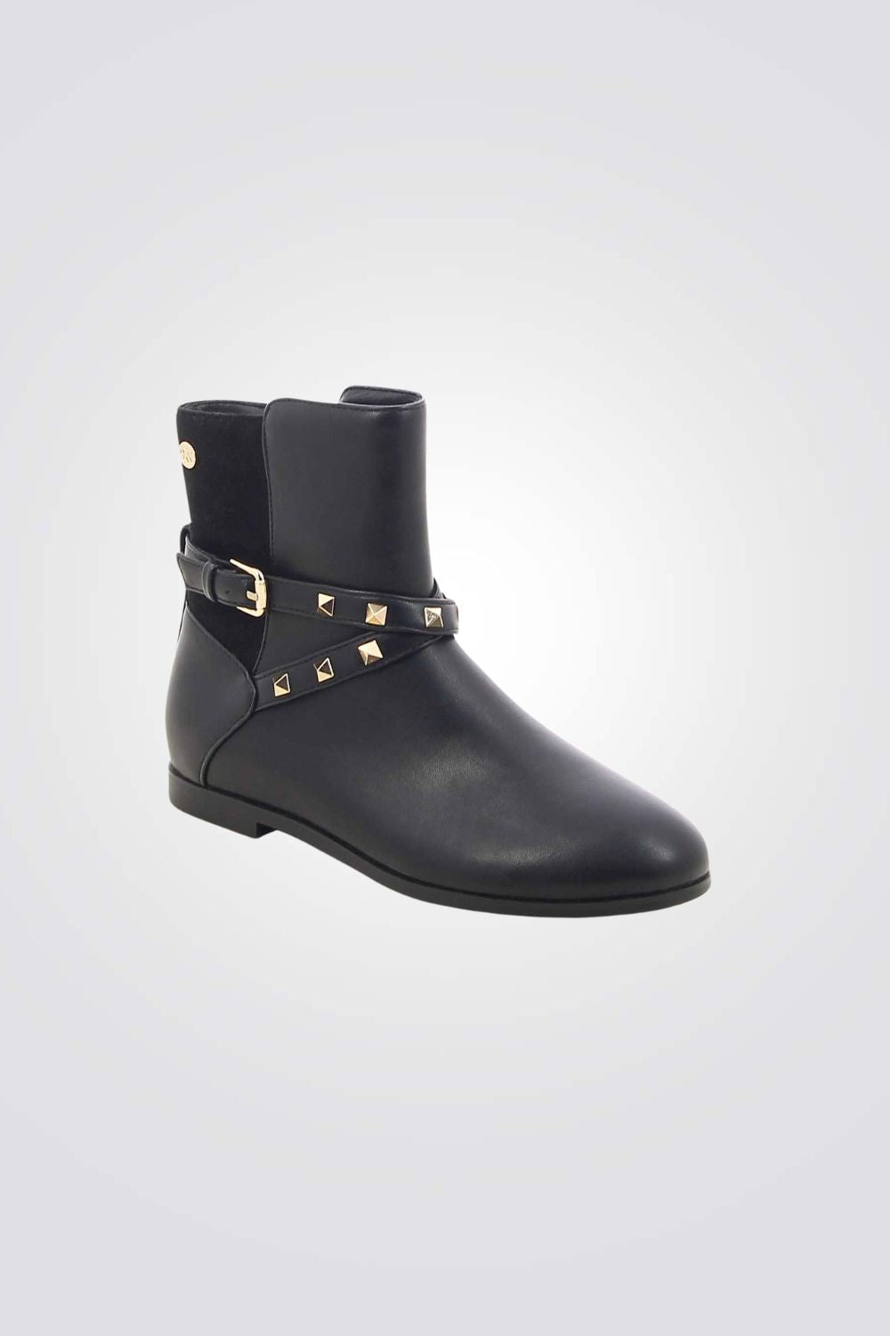 מגפונים מבית המותג NINE WEST בצבע שחור עם רצועה קדמית מתכוננת בשילוב עיטורי ניטים מוזהבים וסגירת רוכסן צדדית.