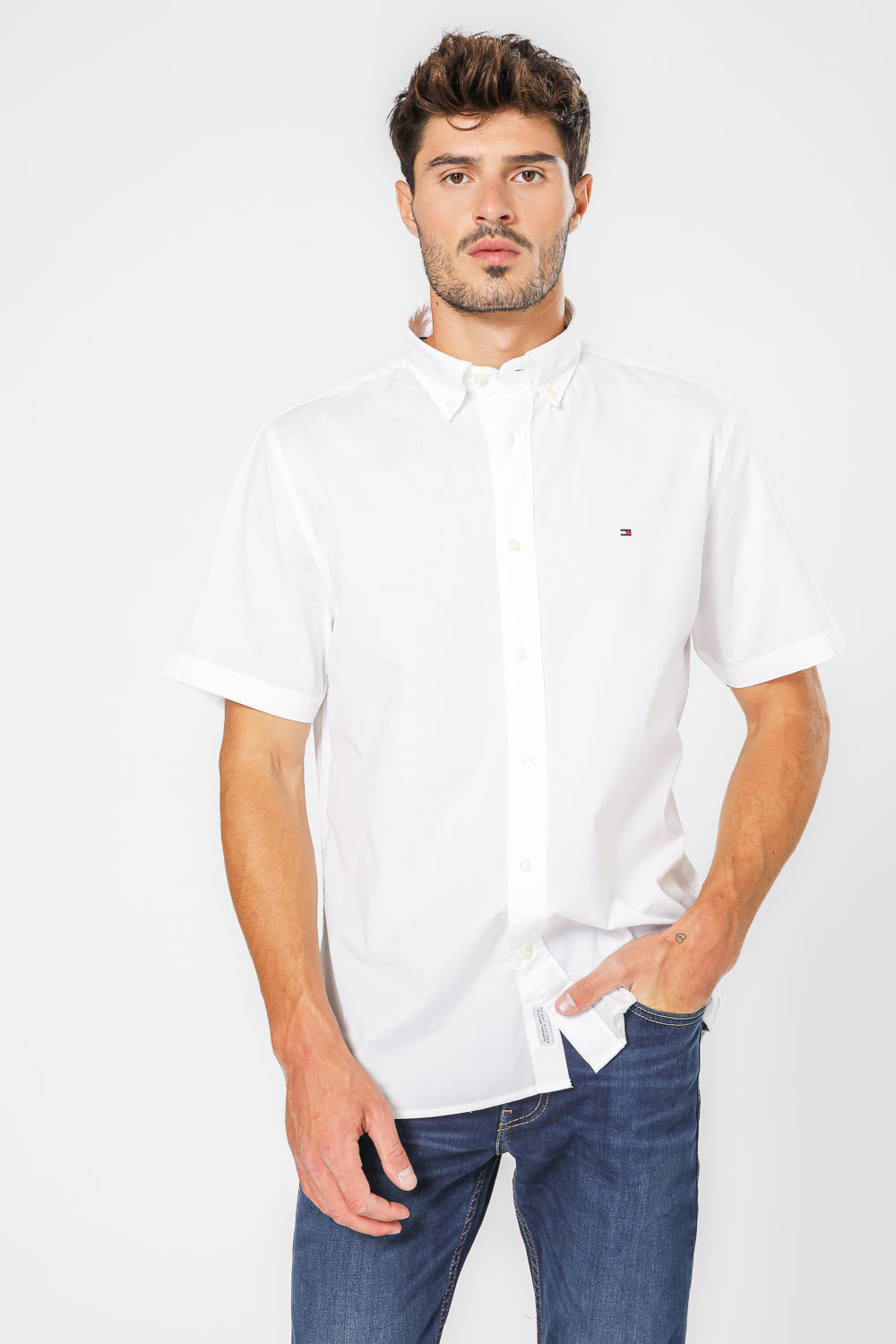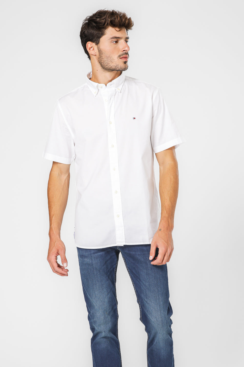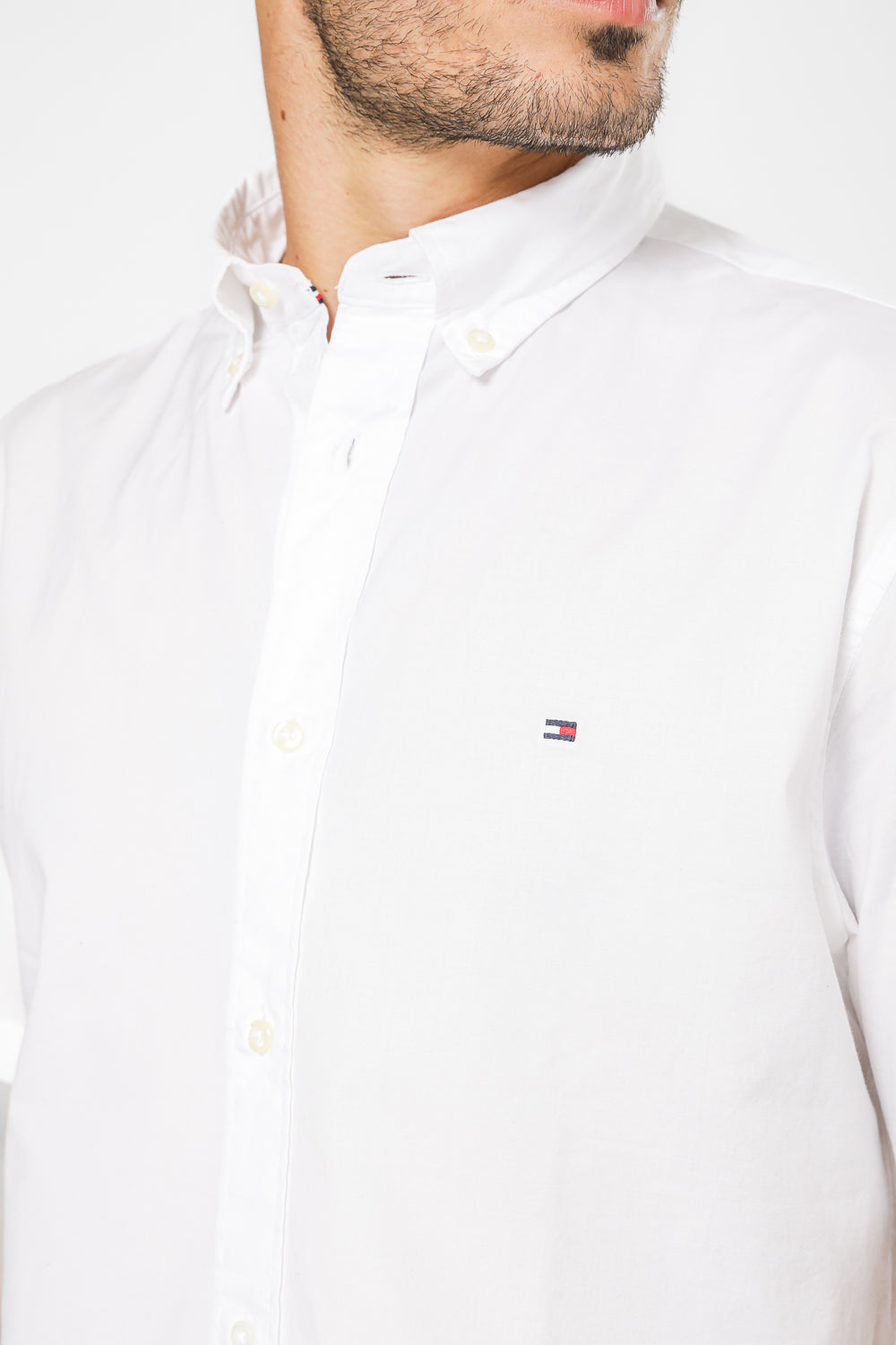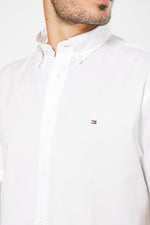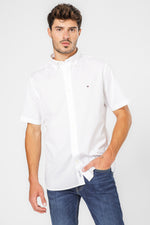חולצה מכופתרת קצרה לגברים מבית המותג Tommy Hilfiger, בצבע לבן, עם צווארון קלאסי וסגירת כפתורים.