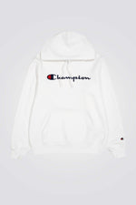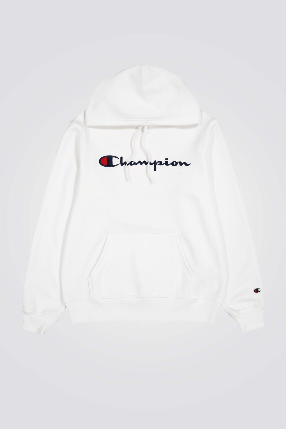 סווטשירט קפוצ'ון לגברים מבית המותג CHAMPION, בצבע לבן, מחמם ונעים עם כיס קנגרו ולוגו המותג.