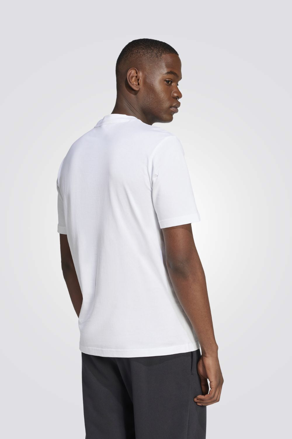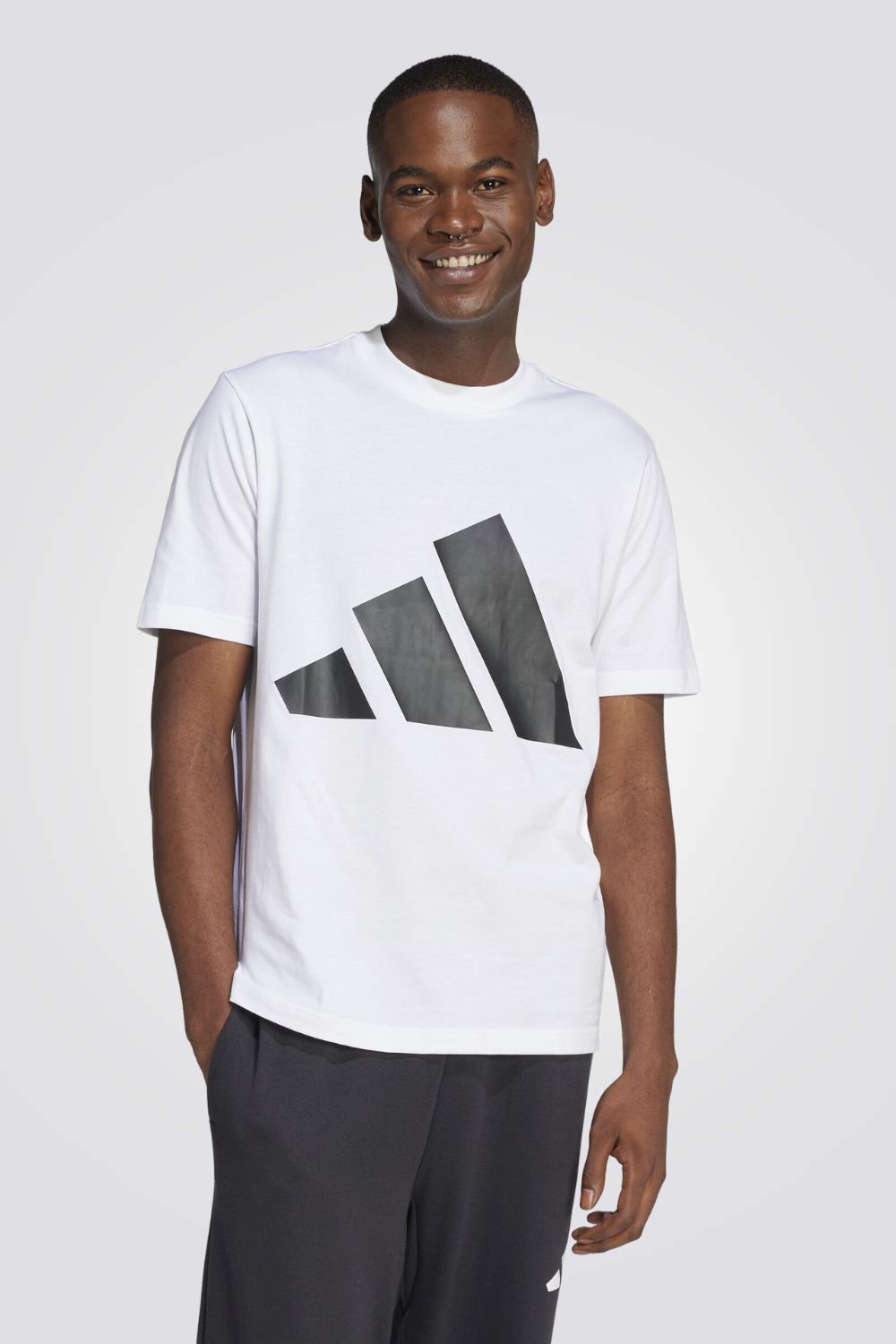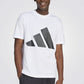 חולצה קצרה מבית המותג ADIDAS לגברים בצבע לבן, מבד קליל, צווארון עגול וסמל המותג בצבע שחור בגדול בקידמת החולצה.