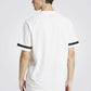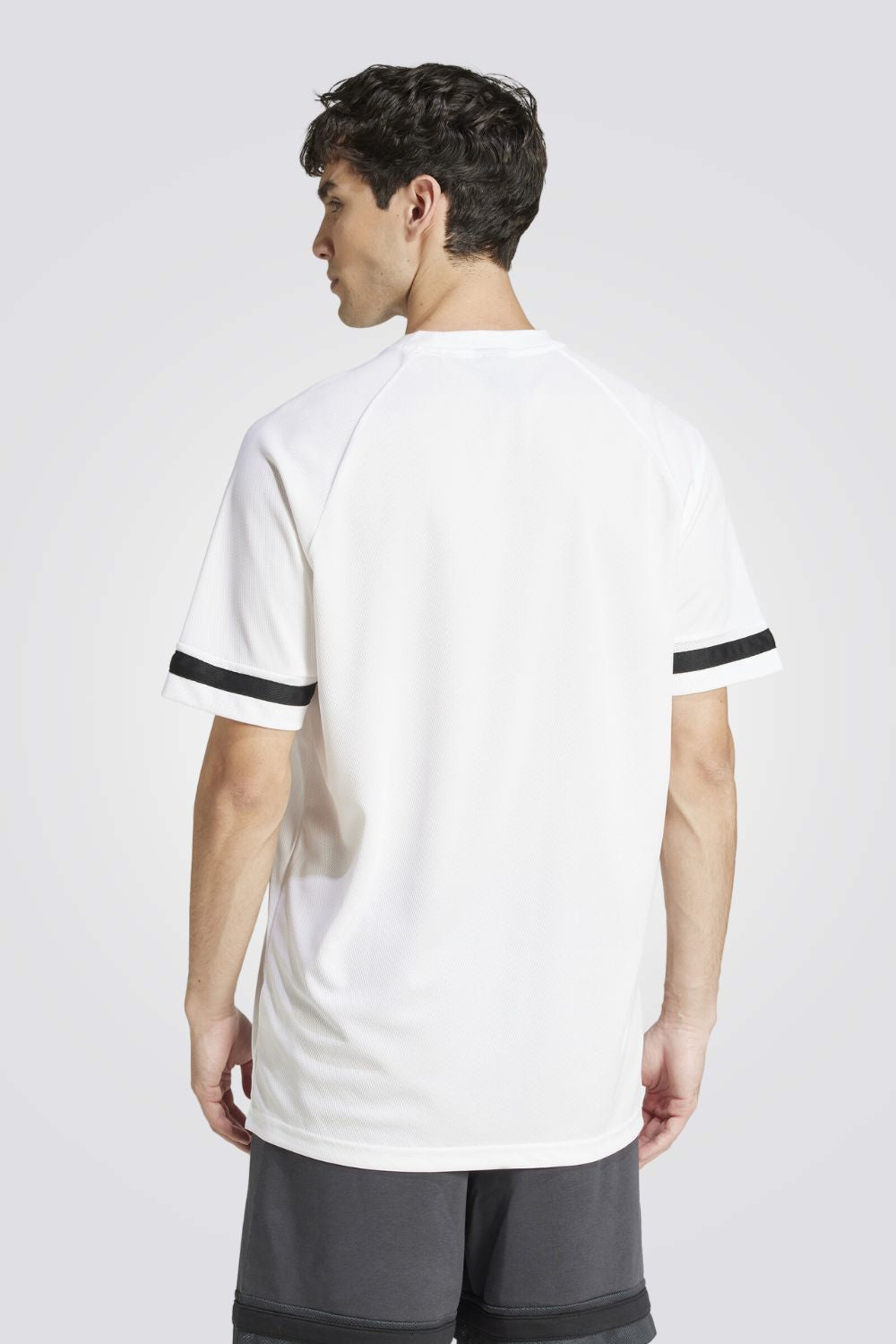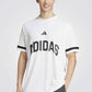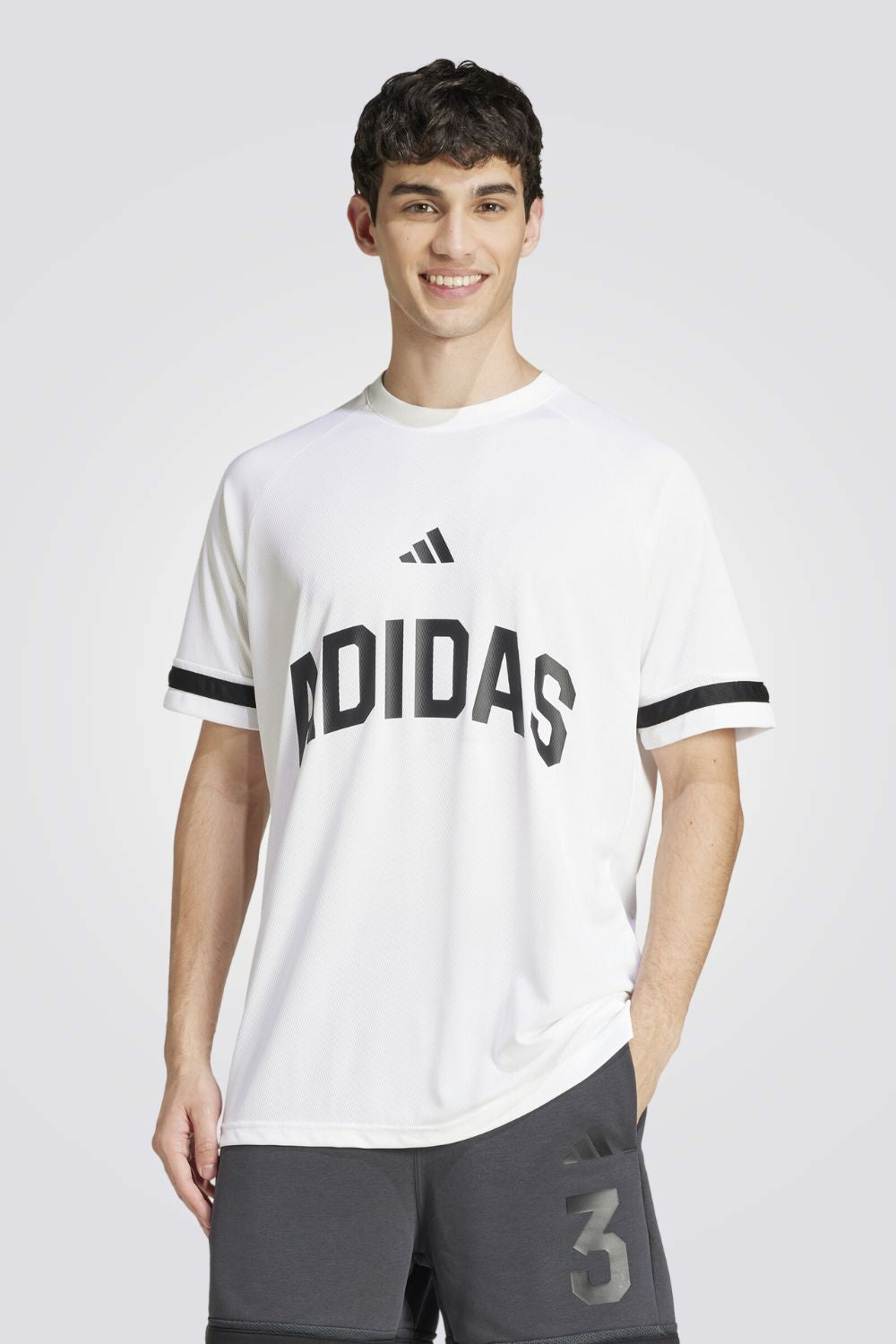 חולצת טריקו מבית המותג ADIDAS לגברים בצבע לבן ושחור, מבד קליל, צווארון עגול וכיתוב המותג בגדול בקידמת החולצה בצבע שחור.