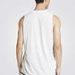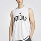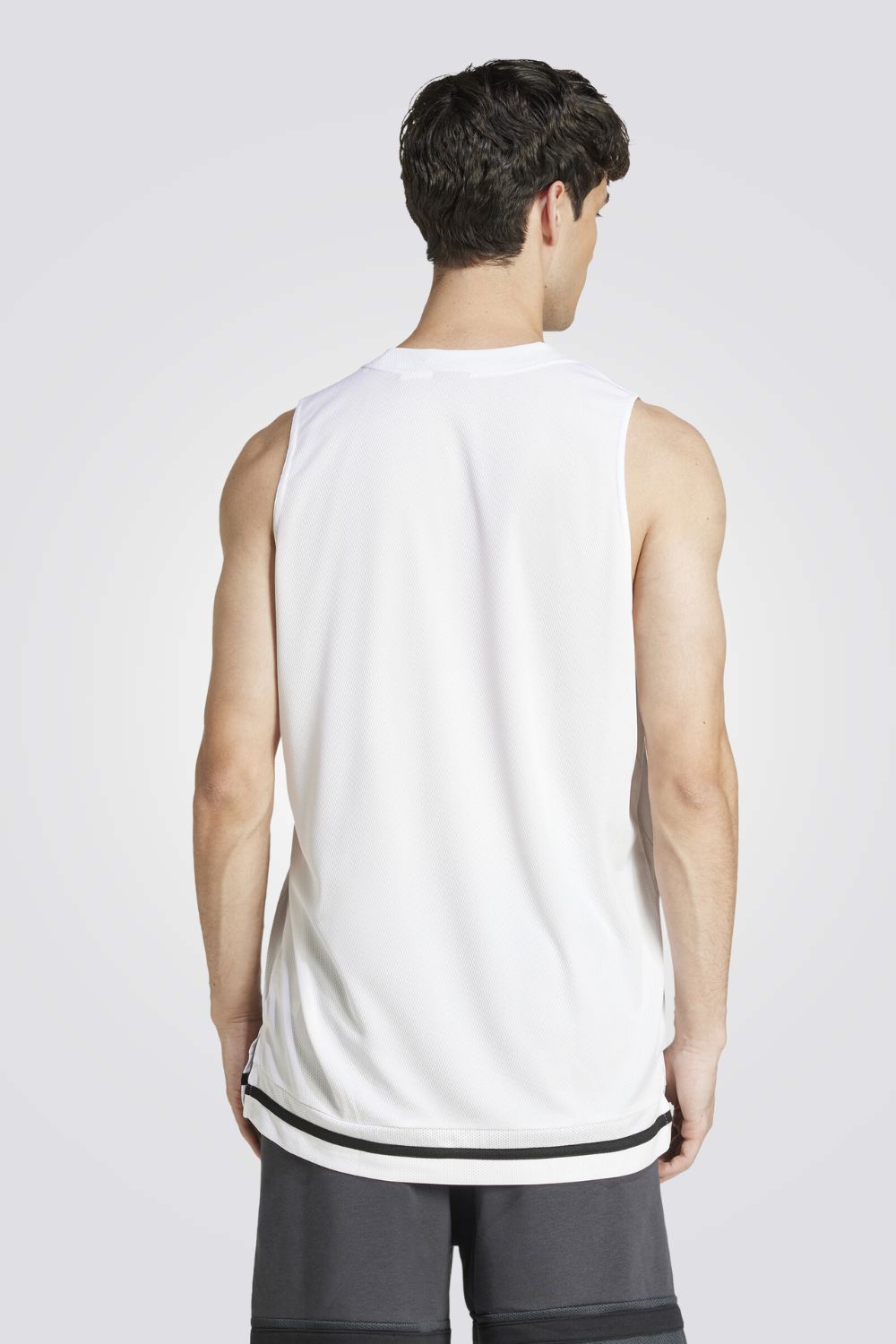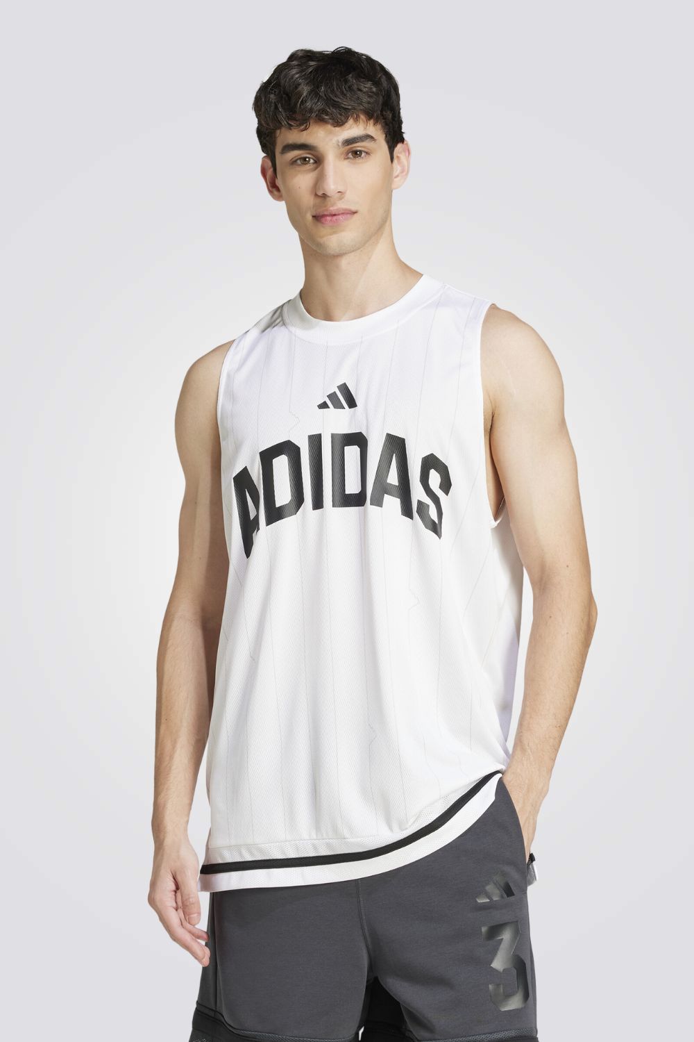 גופיית ספורט מבית המותג ADIDAS לגברים בצבע לבן ושחור, מבד קליל, צווארון עגול וכיתוב המותג בגדול בקידמת החולצה.