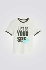 טישירט לילדים מבית המותג OKAIDI, בצבע לבן עם כיתוב ירוק זית , שרוולים קצרים וצווארון עגול .