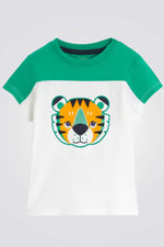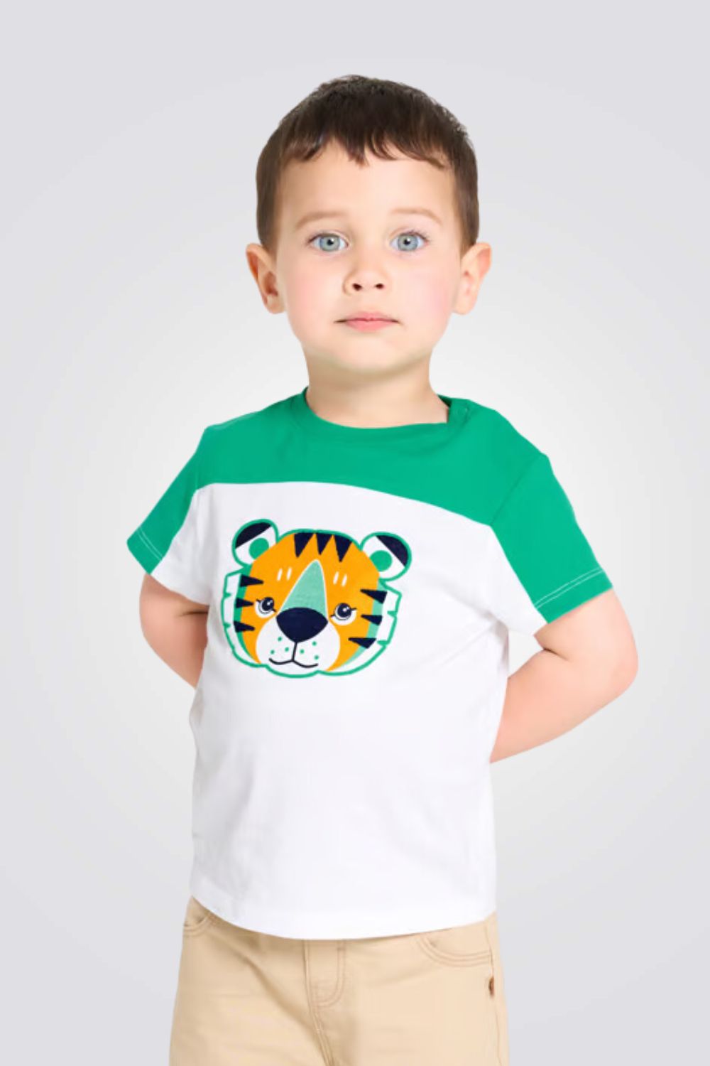 חולצה לתינוקות של המותג OBAIBI בצבע לבן ירוק עם הדפס מתוק של נמר, שרוול קצר וצאוורון עגול.