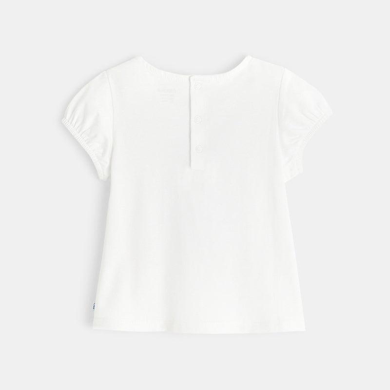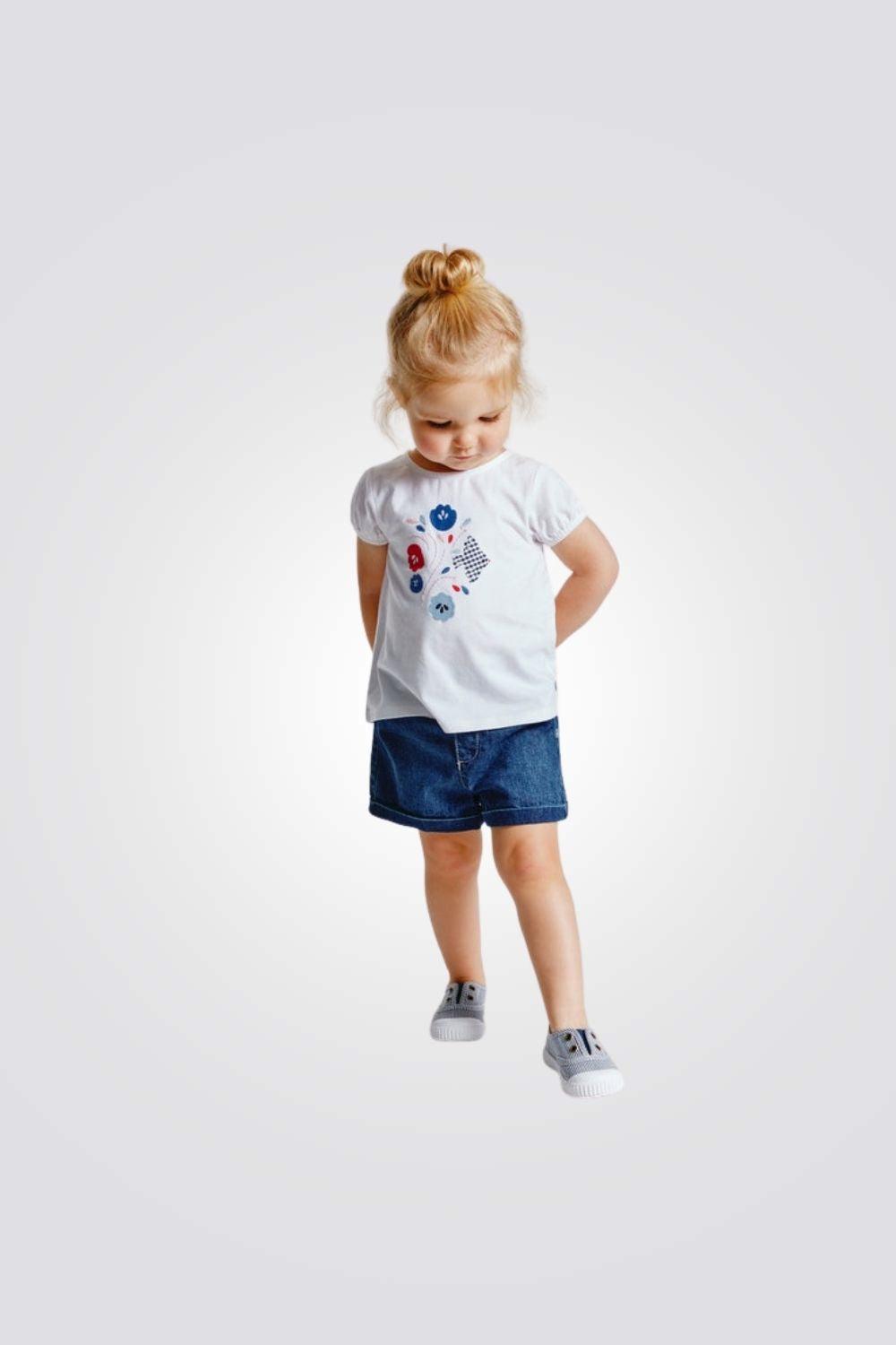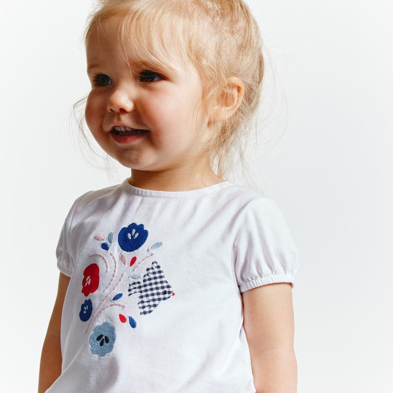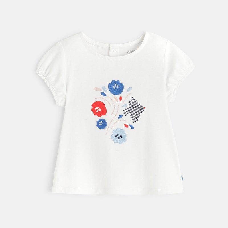 חולצה של המותג OBAIBI לתינוקות. חולצת טי עם שרוולים קצרים אלסטיים מכווצים. הדפס ורקמת פרחים וציפור. כפתורים בגב להלבשה קלה.