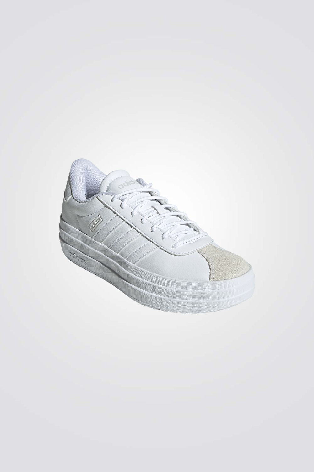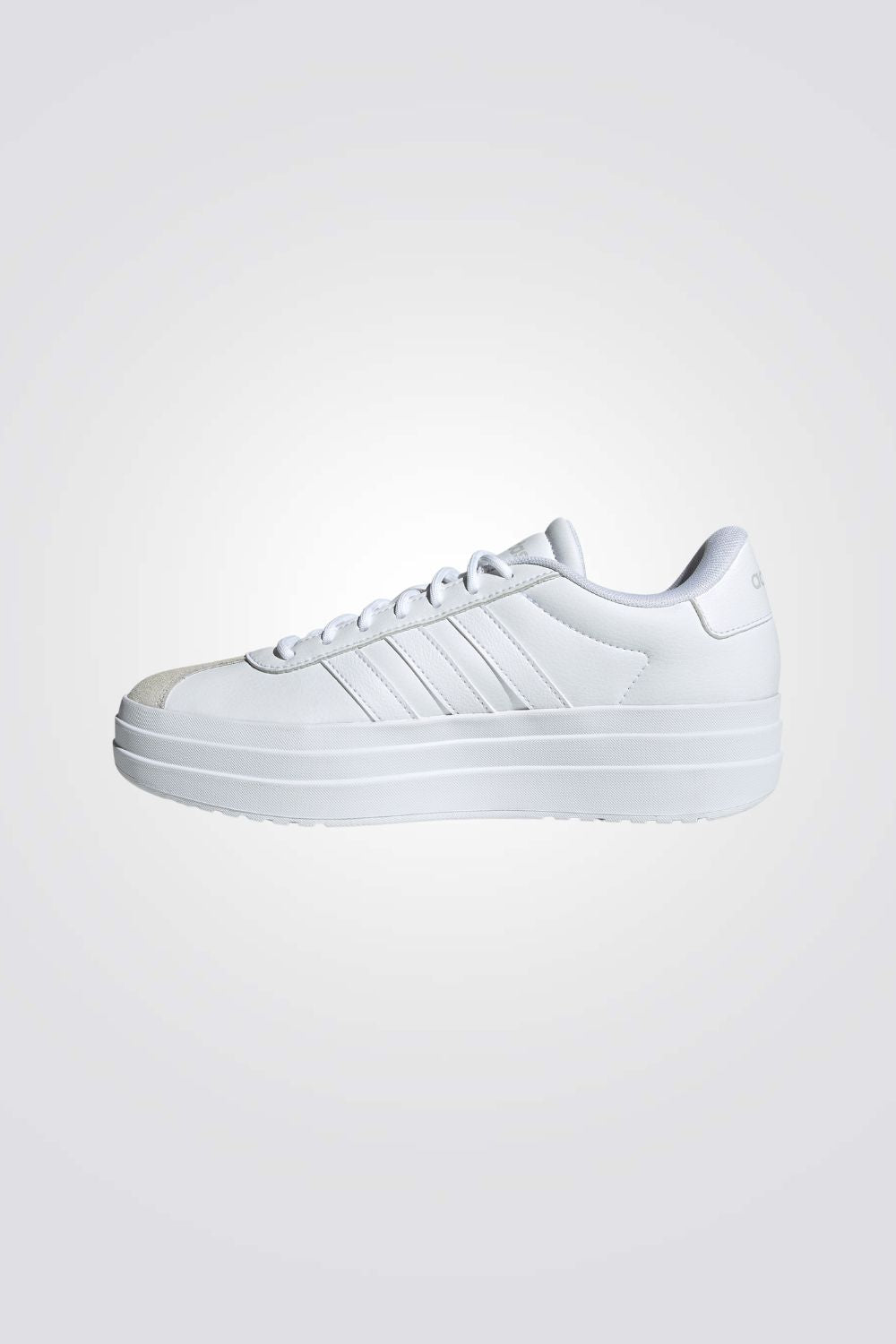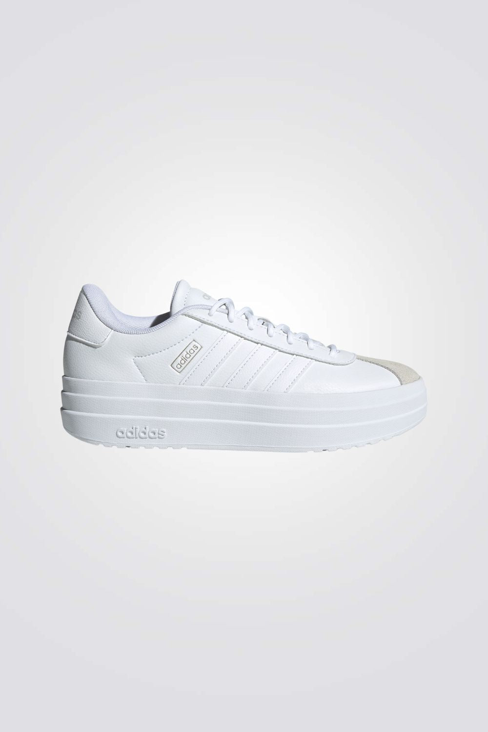 נעלי סניקרס מבית המותג ADIDAS בצבע לבן עם לוגו בצידי הנעל וסוליה חיצונית פלטפורמה מגומי.