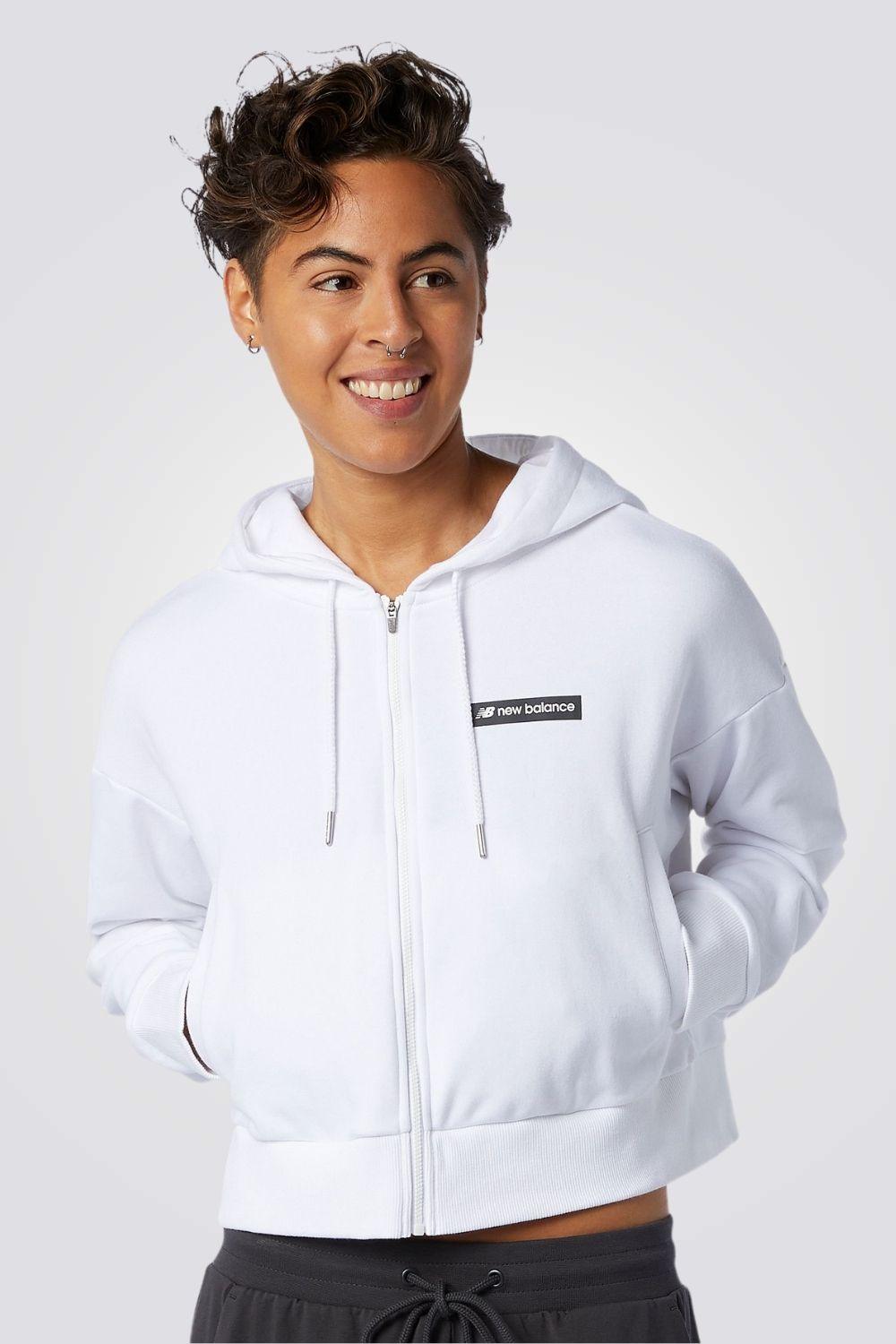 סווטשירט נעים ורך של המותג NEW BALANCE לנשים. מבד כותנה פרנץ' טרי. בגזרה משוחררת עם סגירת רוכסן מלאה והדפס גרפי בגב.