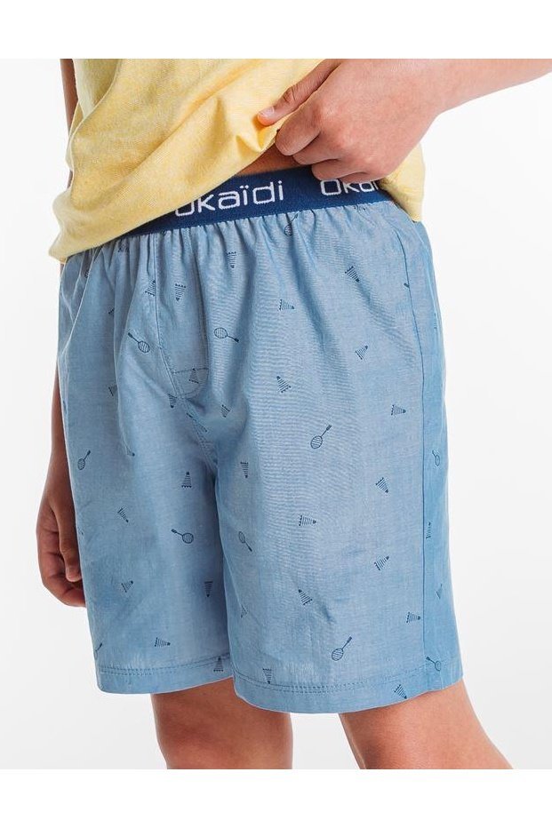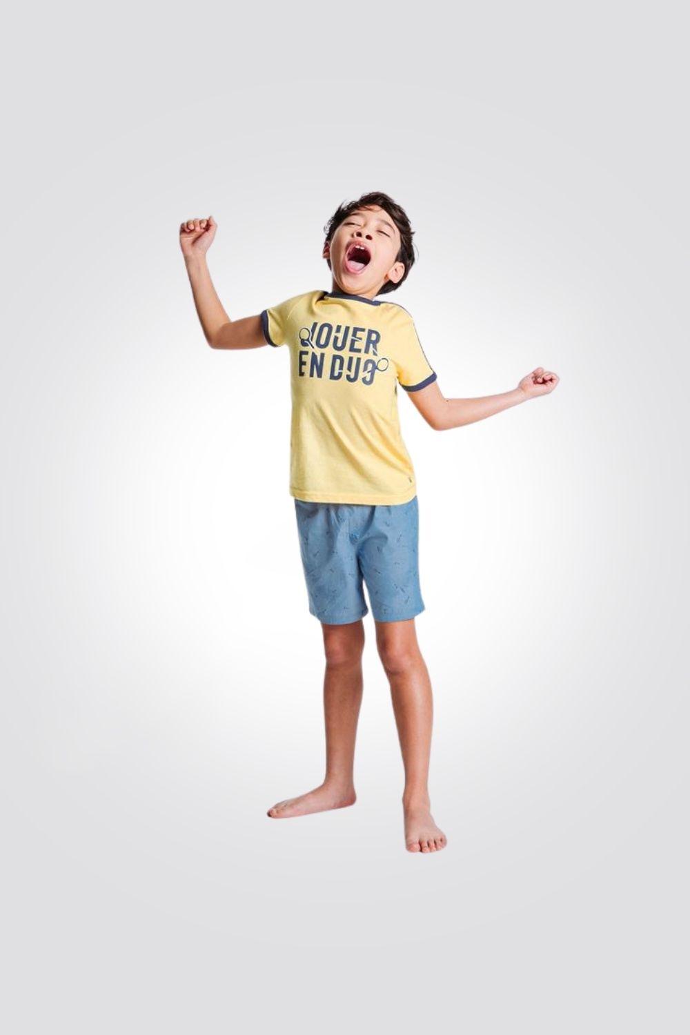 חליפת 2 חלקים, חולצה בצבע צהוב עם הדפס ומכנסיים כחולים במוטיב של טניס. החליפה של המותג OKAIDI. הרכב בד: 100% כותנה.